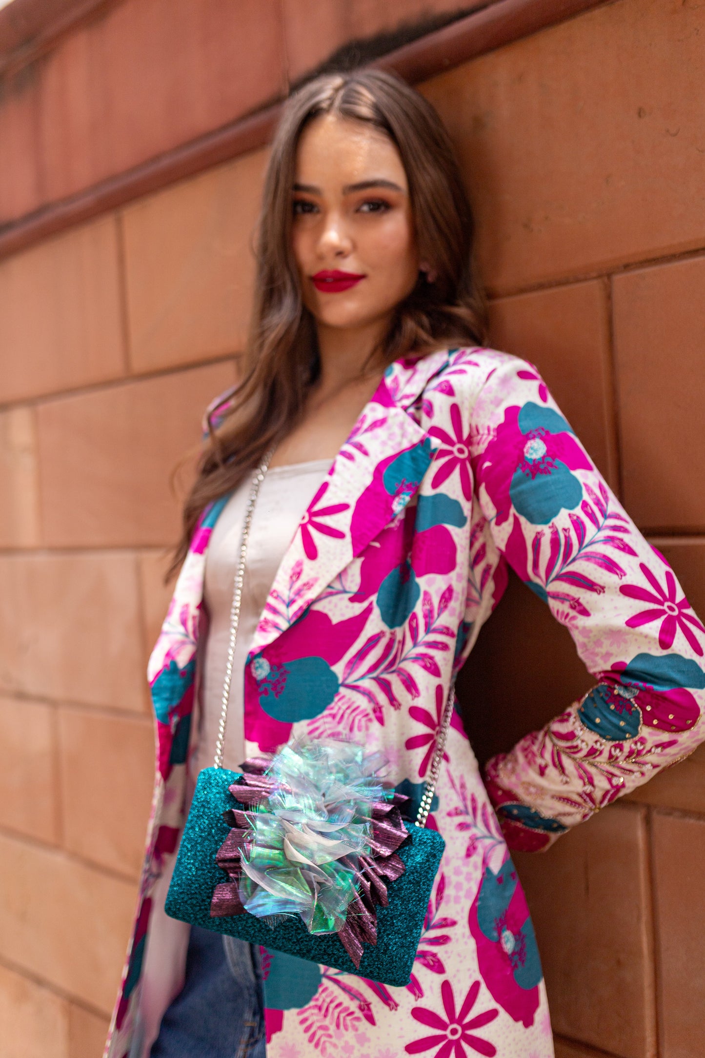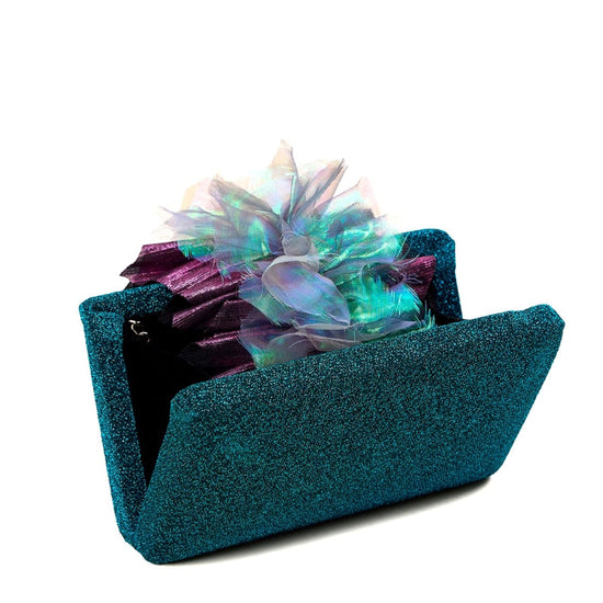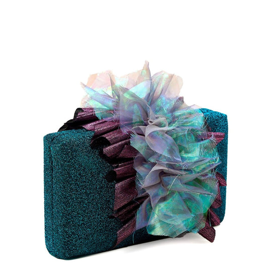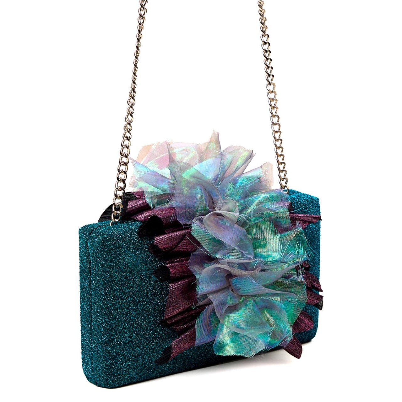 - Blue shimmer fabric clutch with multi colored exaggerated organza frills as closure
