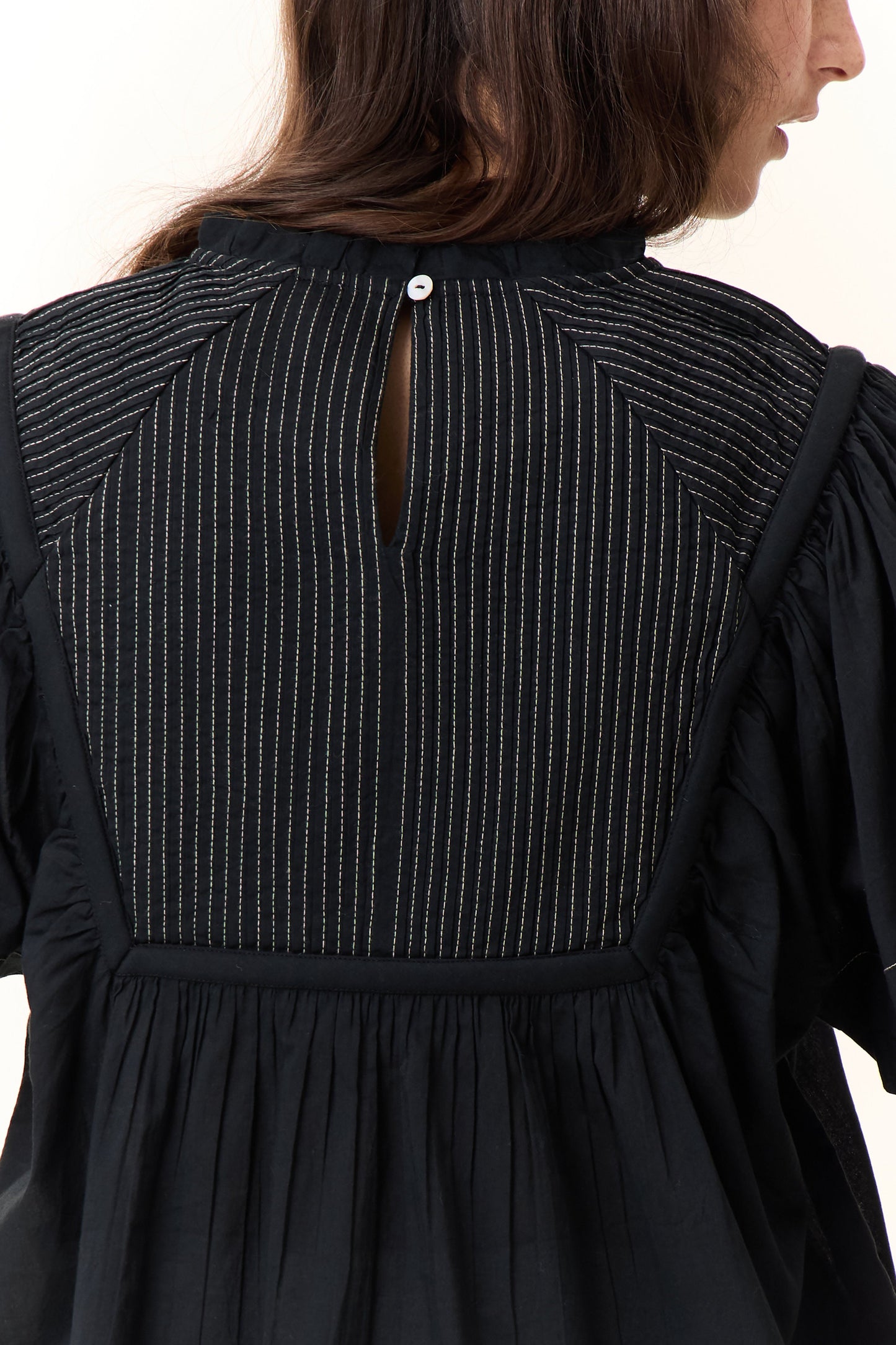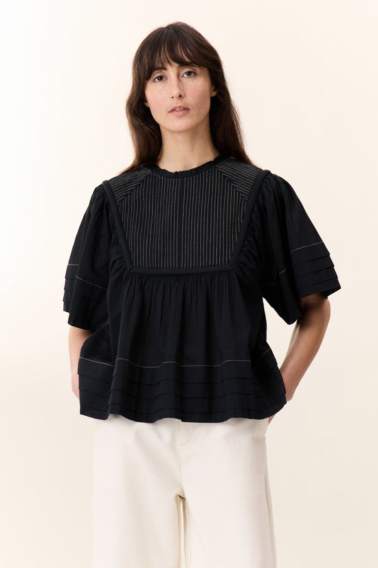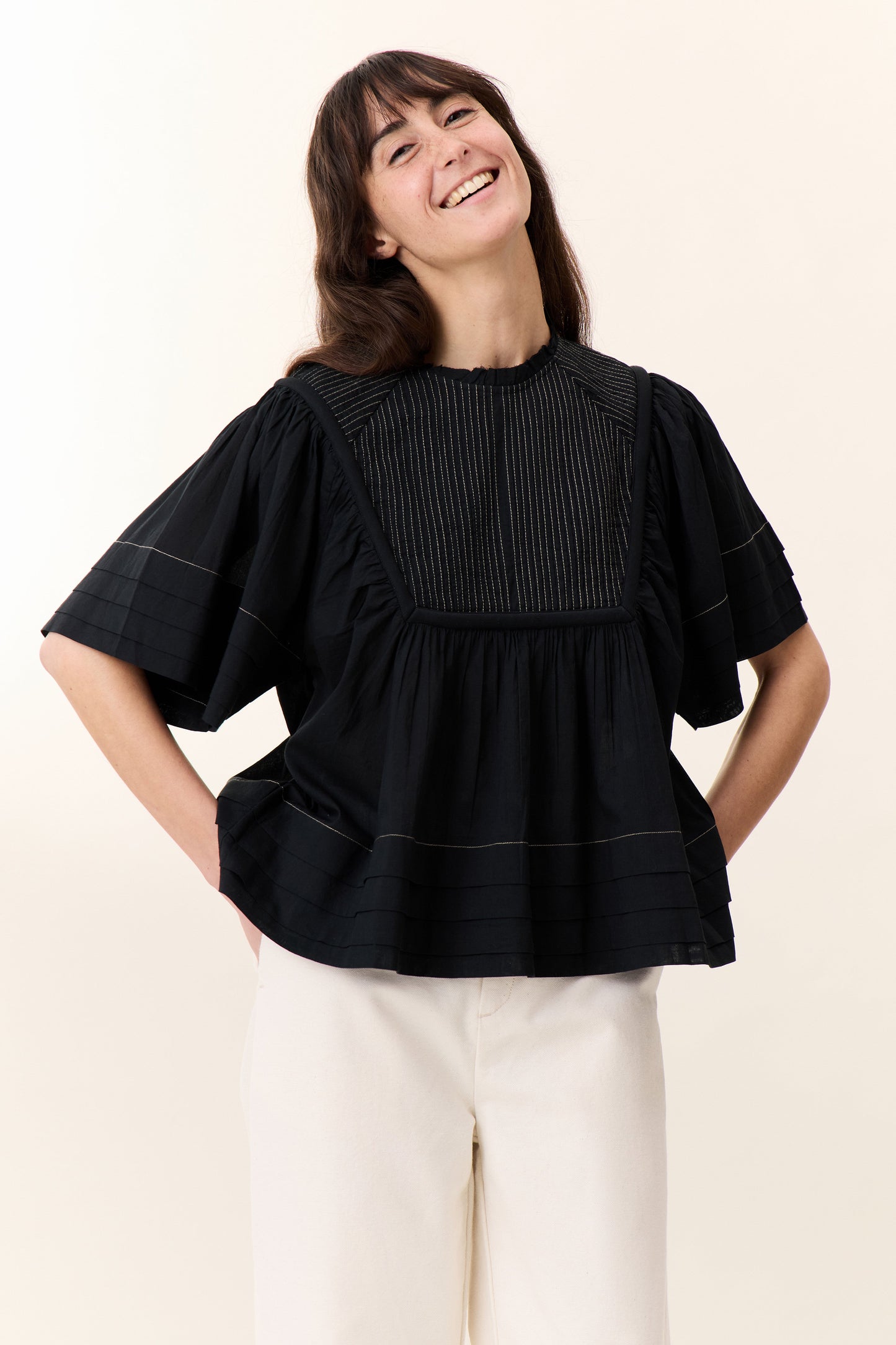 The Clive Pintuck Black Blouse is a refined essential with a vintage-inspired touch. Made from 100% organic cotton, this breathable, lightweight blouse features intricate pintuck detailing and delicate ruffle accents for an effortlessly romantic feel. The relaxed silhouette makes it perfect for layering or wearing solo, whether you're dressing it up or keeping it casual.