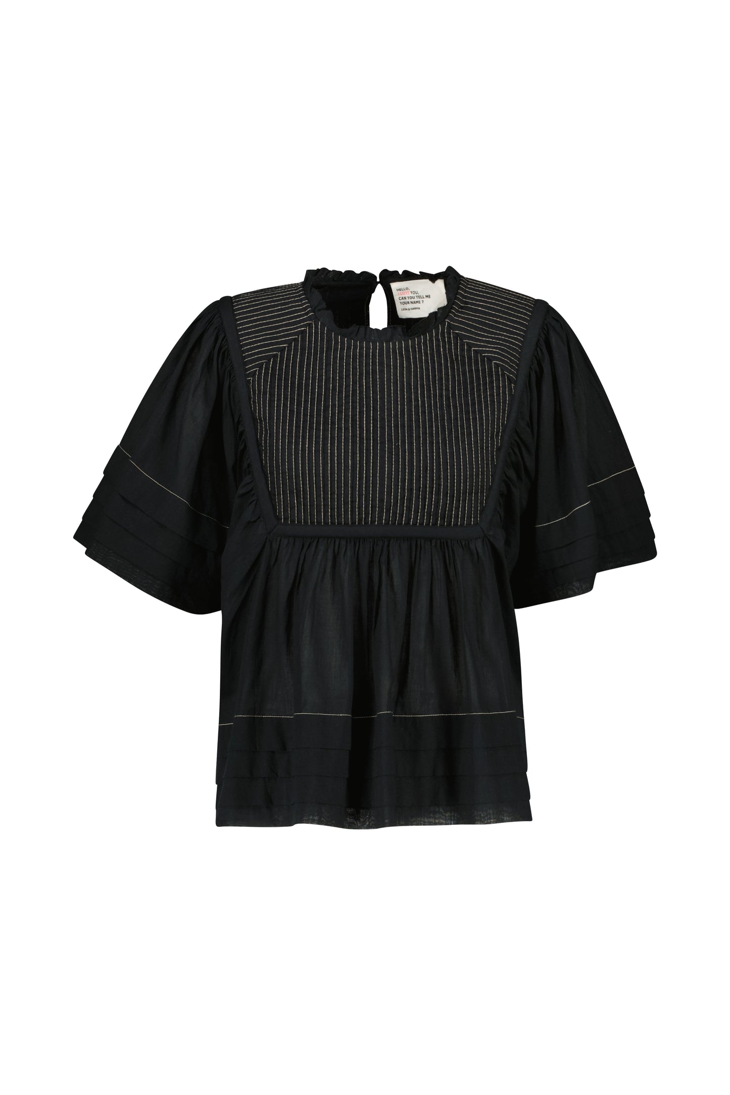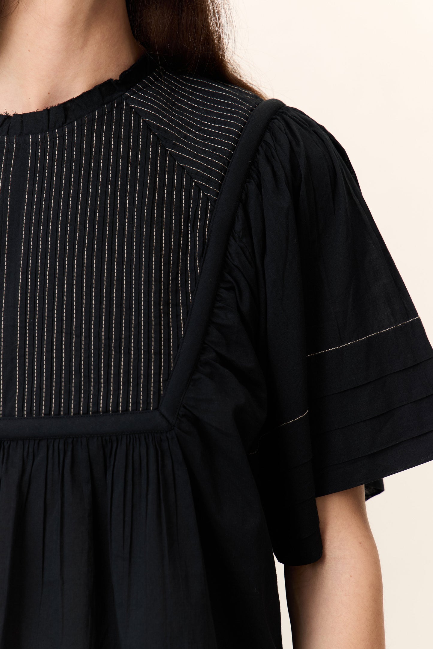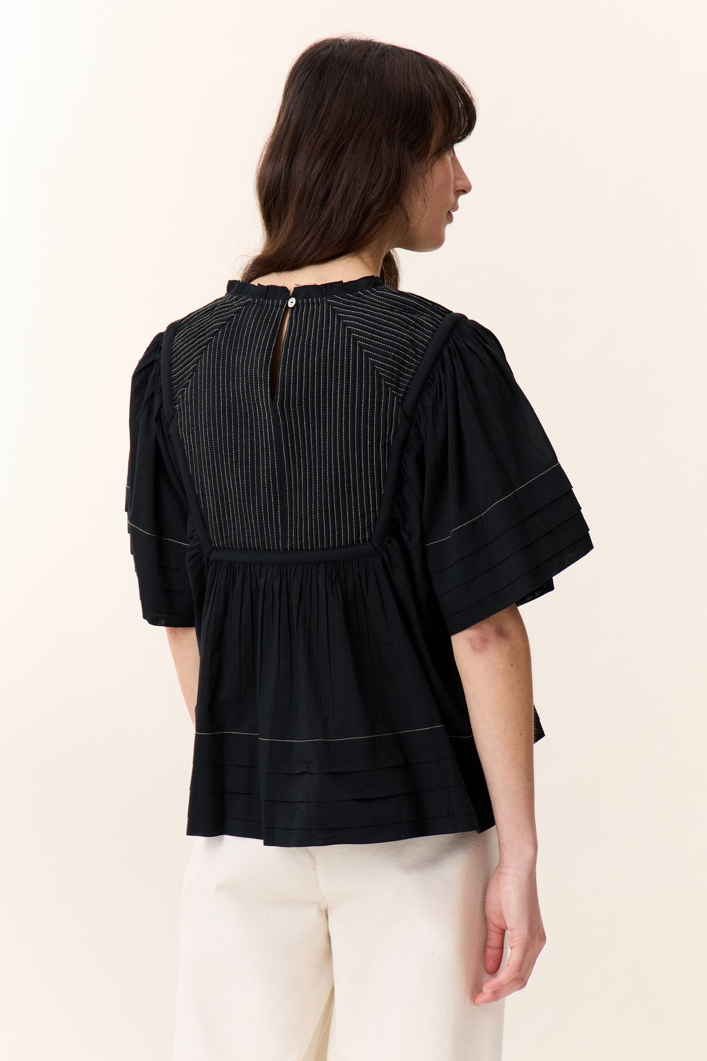 The Clive Pintuck Black Blouse is a refined essential with a vintage-inspired touch. Made from 100% organic cotton, this breathable, lightweight blouse features intricate pintuck detailing and delicate ruffle accents for an effortlessly romantic feel. The relaxed silhouette makes it perfect for layering or wearing solo, whether you're dressing it up or keeping it casual.
