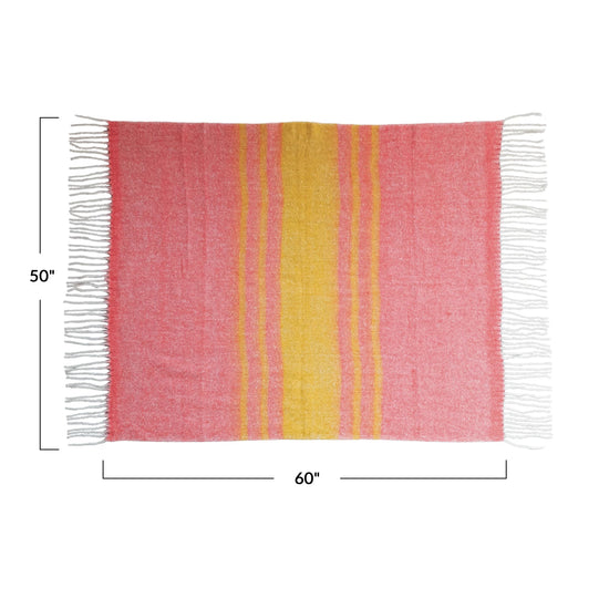 60"L x 50"W Brushed Acrylic & New Zealand Wool Throw w/ Stripes & Fringe, Pink & Yellow