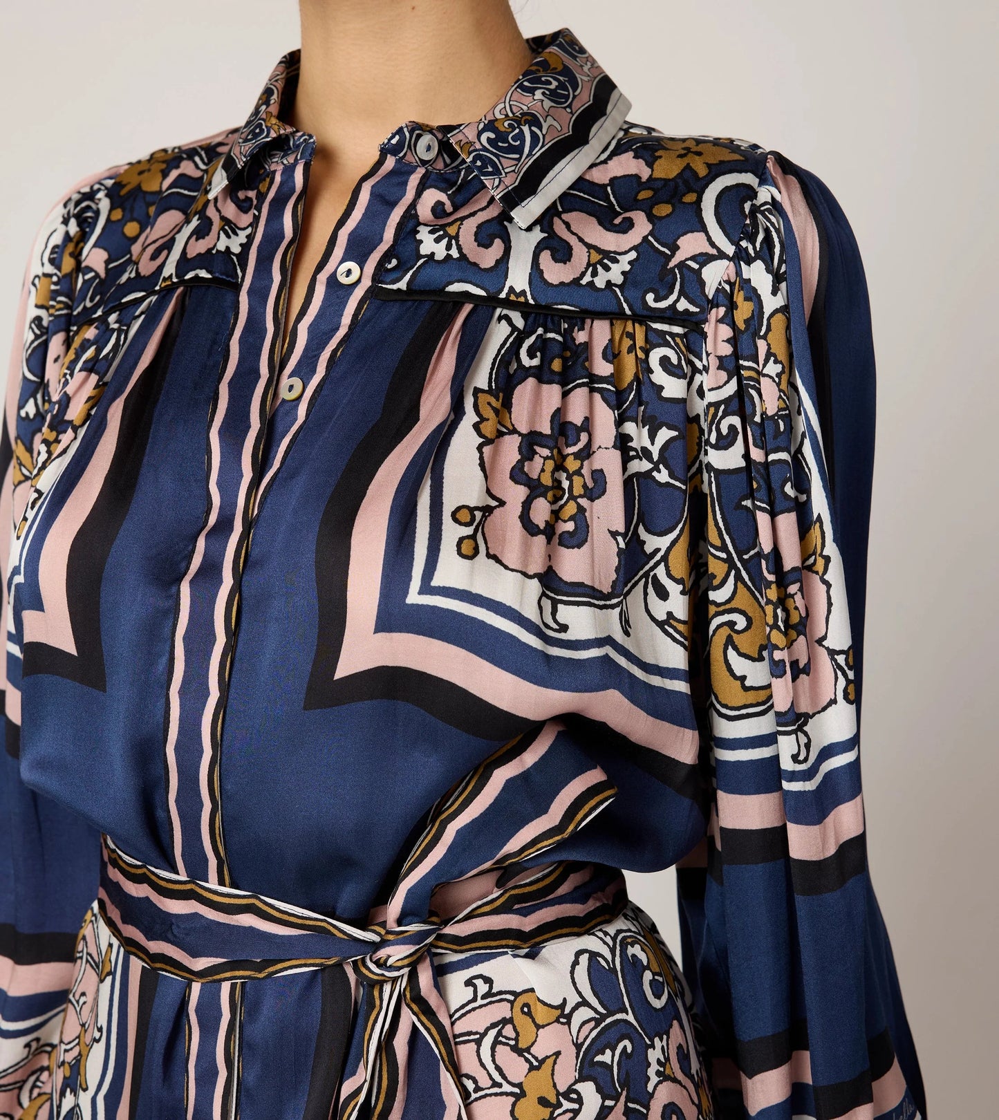 - Removable tie at waist and button down front