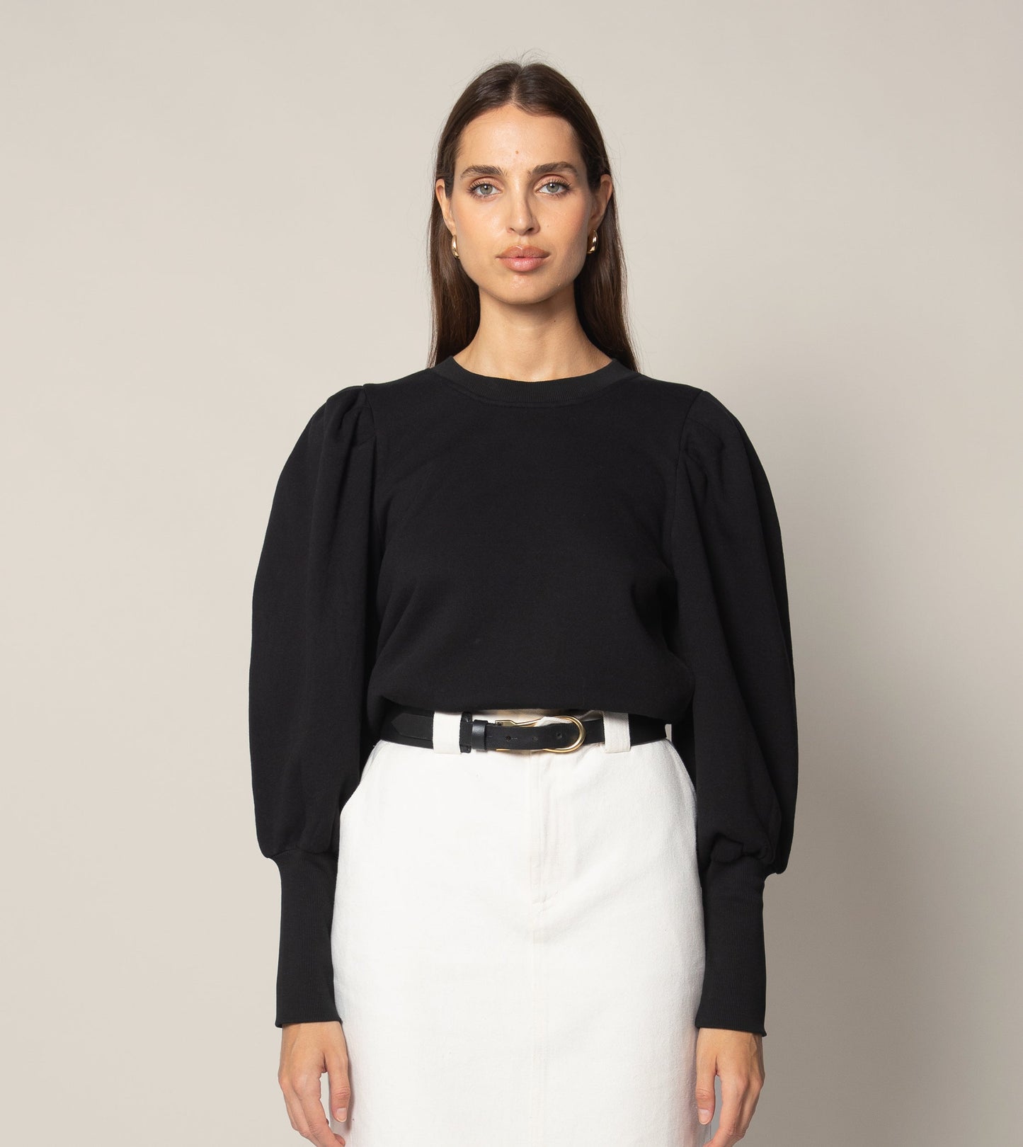 Introducing Cleobella's Core Collection. In organic cotton fleece, The Indi Sweatshirt features puffed high cuff sleeves for an elevated take on loungewear. Whether you're dressing it up or down, it's perfect for staying warm on chillier days. Pair back to any of our bottoms for an chic yet comfortable look. See below for styling inspo!