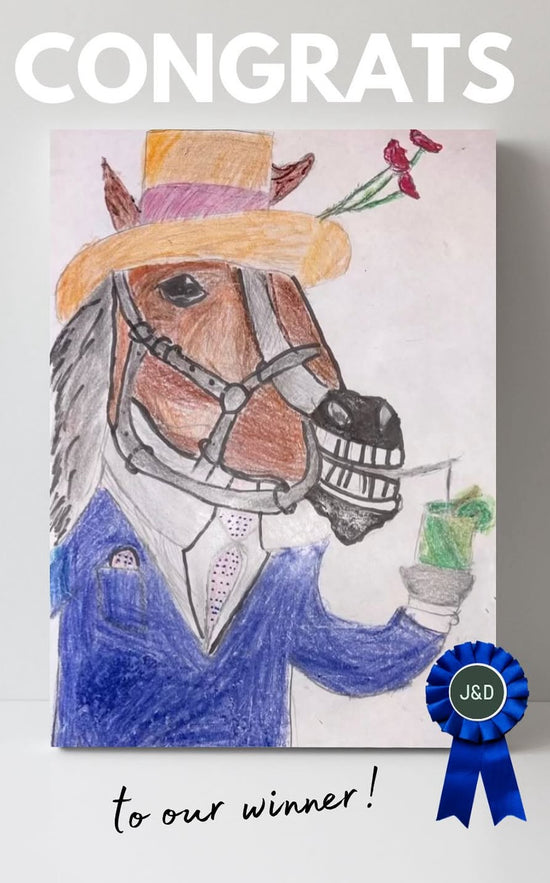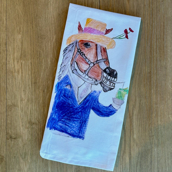 Created for our Derby-inspired Kids Art Contest, this standout entry appears on tea towels and mugs, sold exclusively at Jones & Daughters. Proceeds will benefit the Backside Learning Center, an organization supporting track workers and their families.