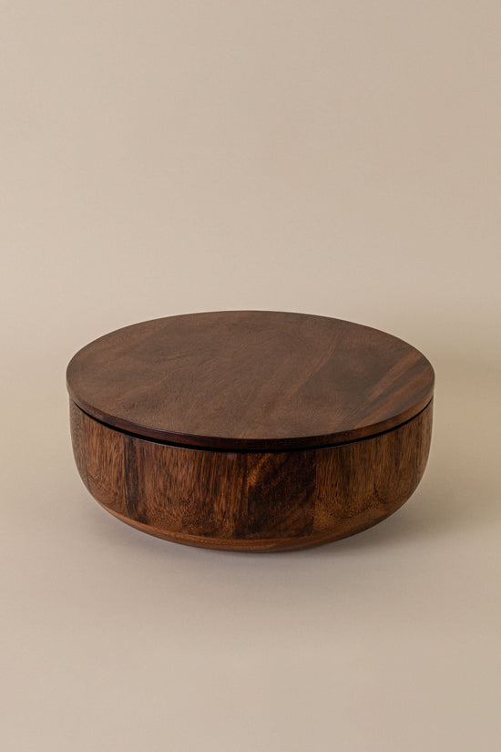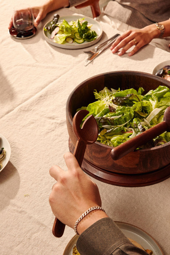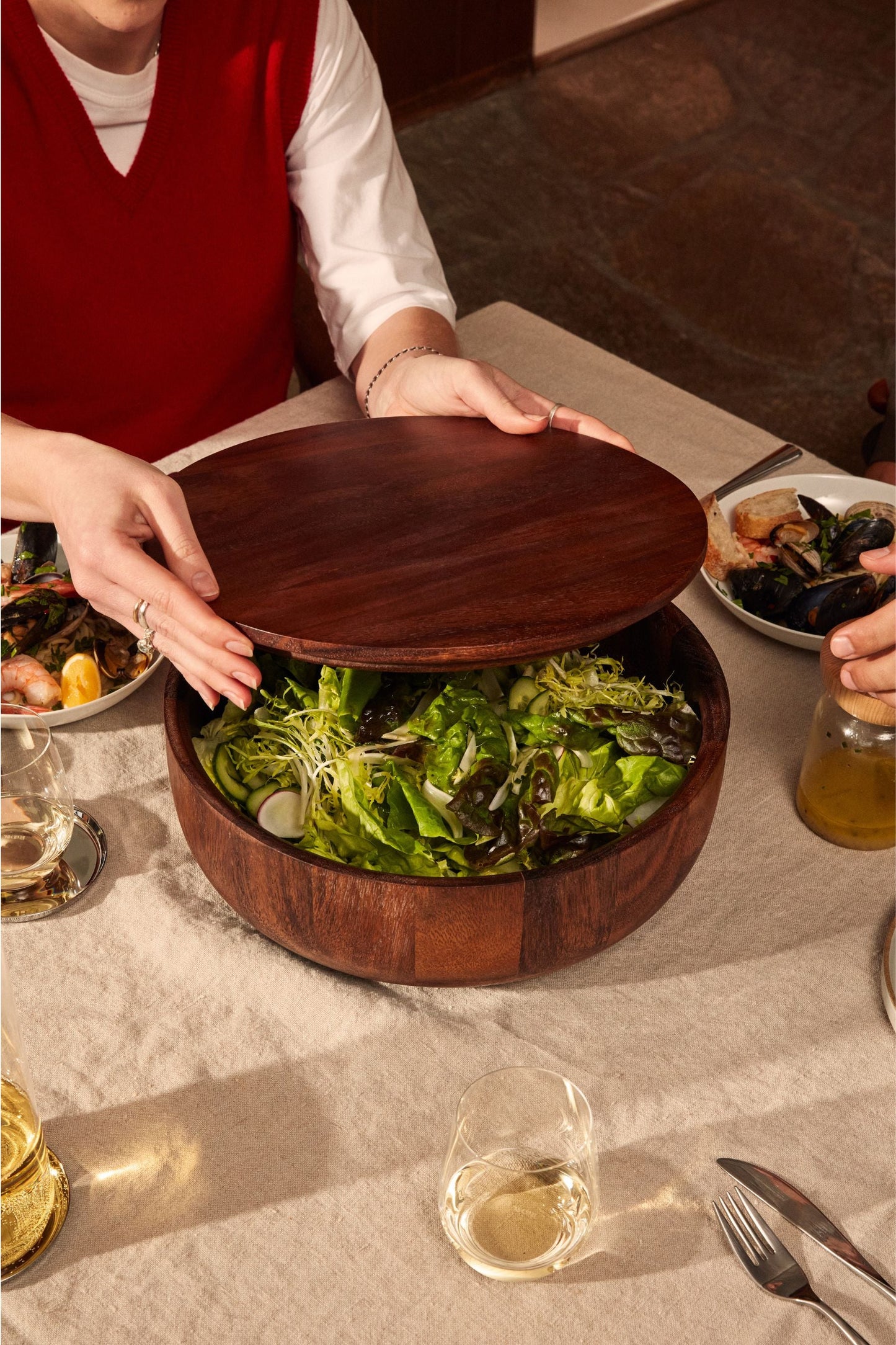The Dot Salad Bowl is the perfect addition to any occasion. Crafted from walnut wood, it features a large capacity and sloped sides, making it easy to serve every last bit of salad. Whether hosting a dinner party or bringing a dish to one, the Dot Salad Bowl includes a matching walnut lid to keep salad fresh until it’s time to serve. When ready, the lid fits neatly under the bowl for an elevated presentation.