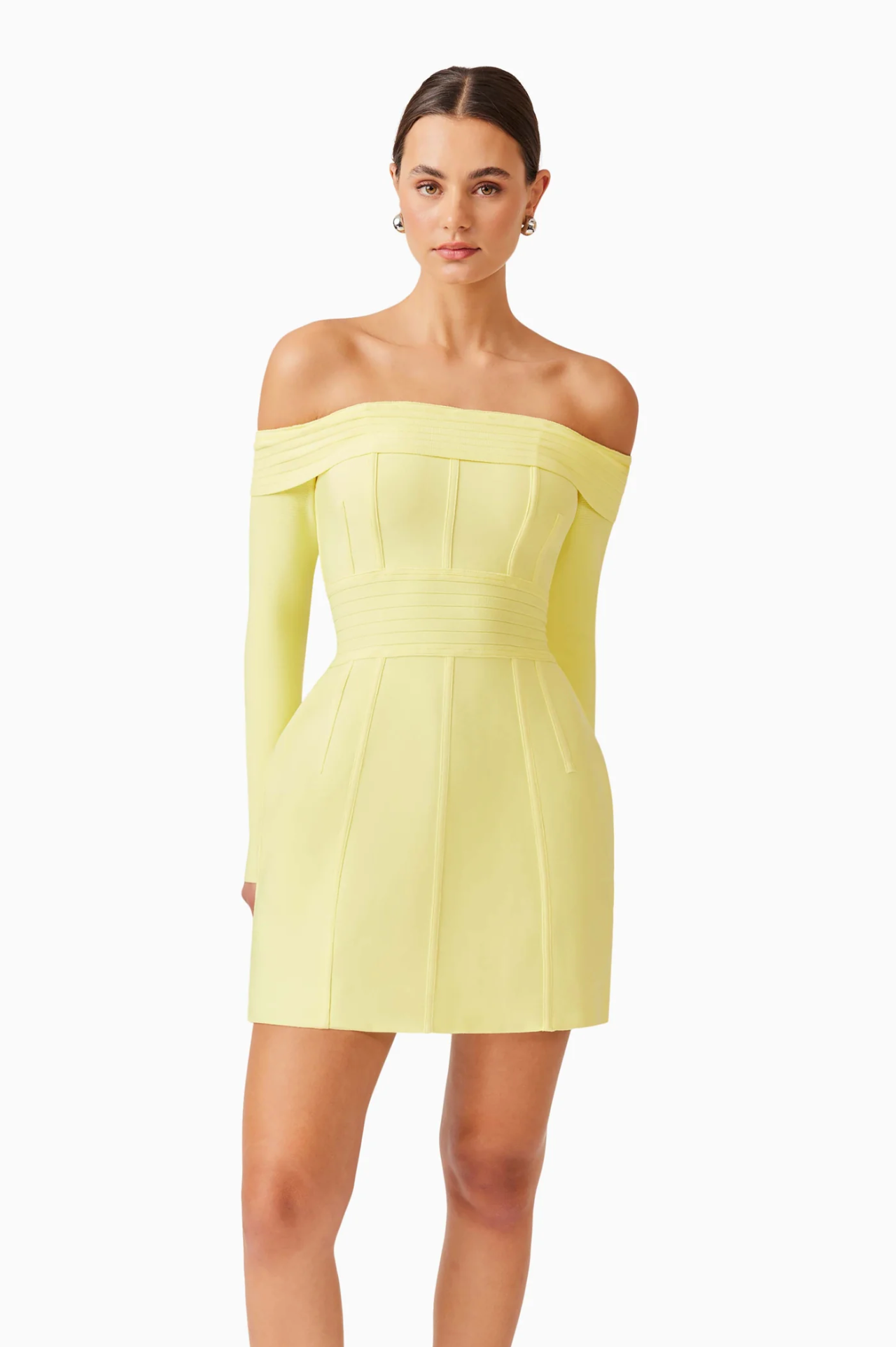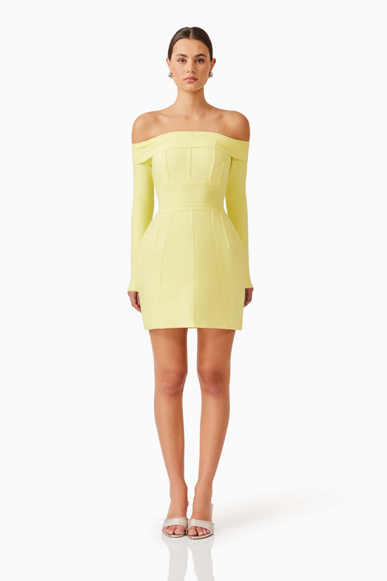 Make an unforgettable entrance in the Katlyn Off-The-Shoulder Mini Dress in Yellow. Designed for confidence and elegance, this dress features a strapless neckline that beautifully highlights the shoulders and collarbone. The boned bodice provides structured support, ensuring a secure and sculpted fit. Made from a premium double knit fabrication, this dress hugs the body in all the right places while allowing for comfortable movement.