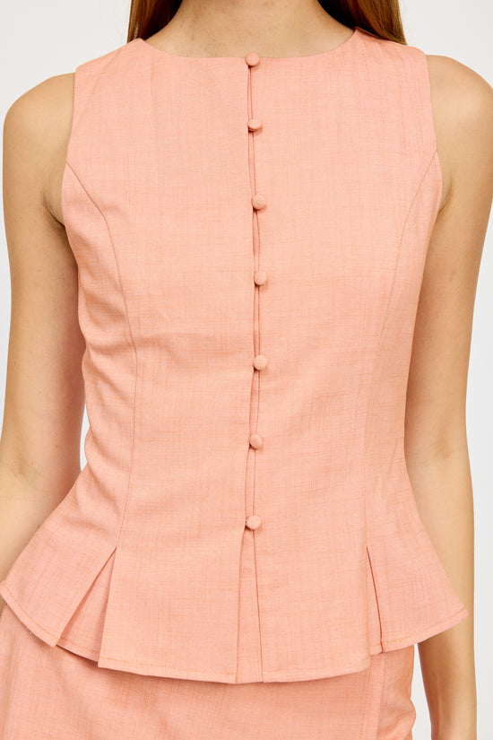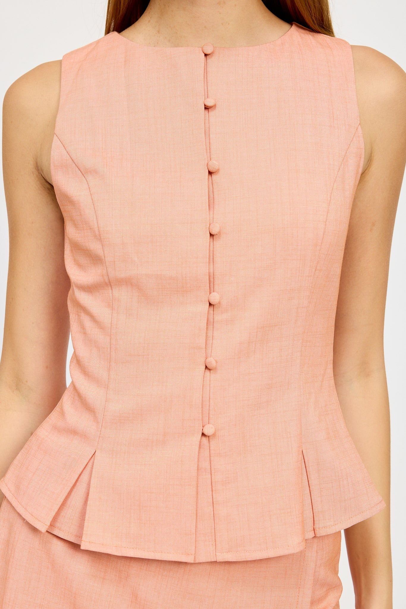 The contoured seams and sculpted bodice create a flattering shape, while fabric-covered buttons add a refined touch along the front closure. A subtle peplum hem with pleated details enhances movement and elegance, giving the top a sophisticated edge.