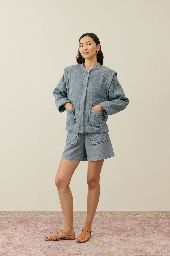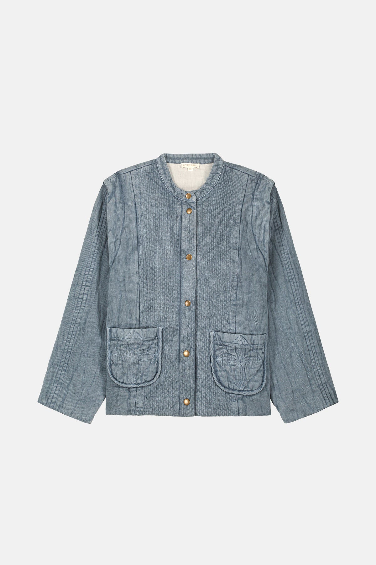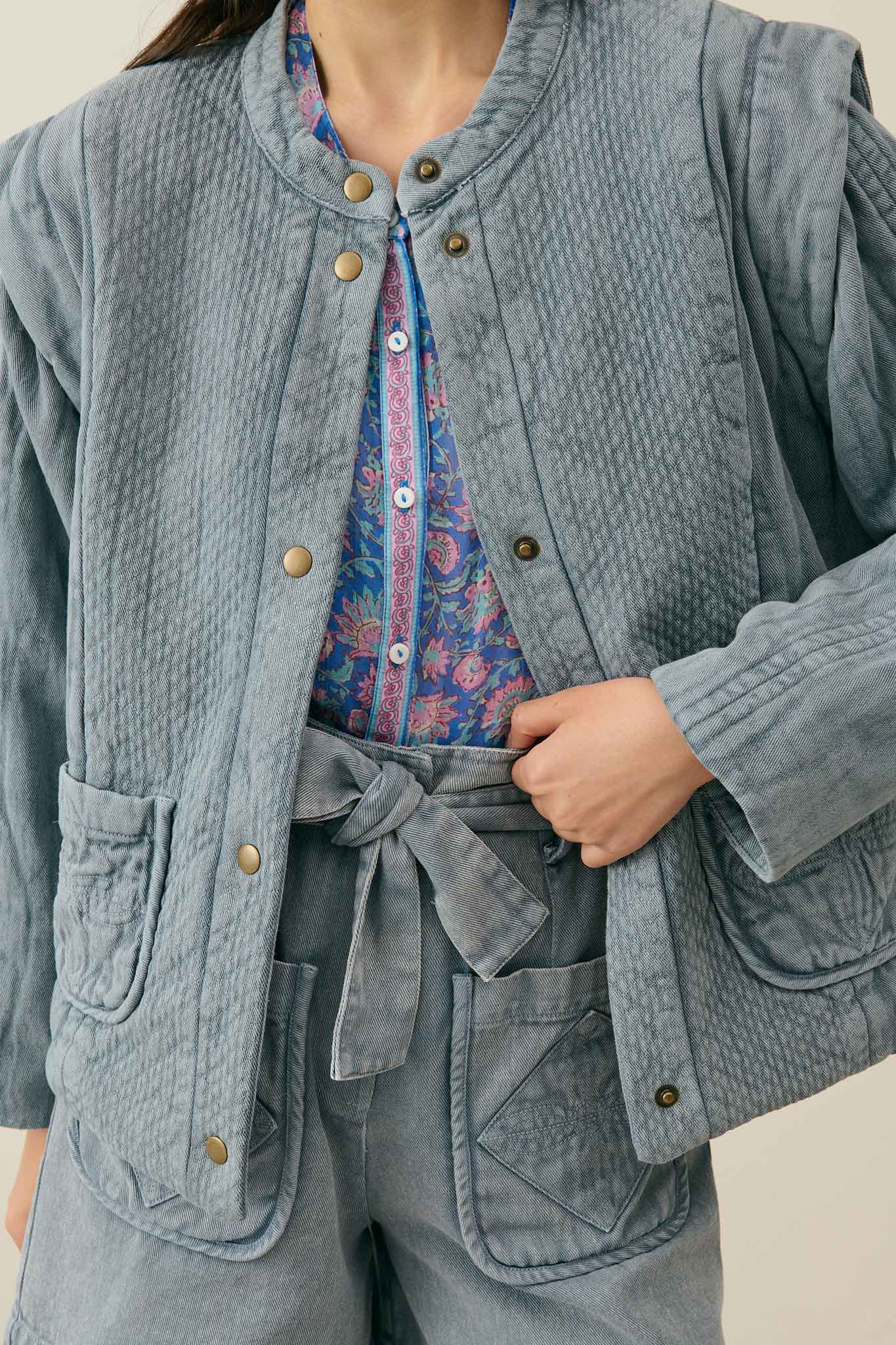 Made from 100% organic cotton with a quilted finish, floral embroidery, and contrast piping. Features an open front and a relaxed fit, perfect for layering over everything from tees to knits.