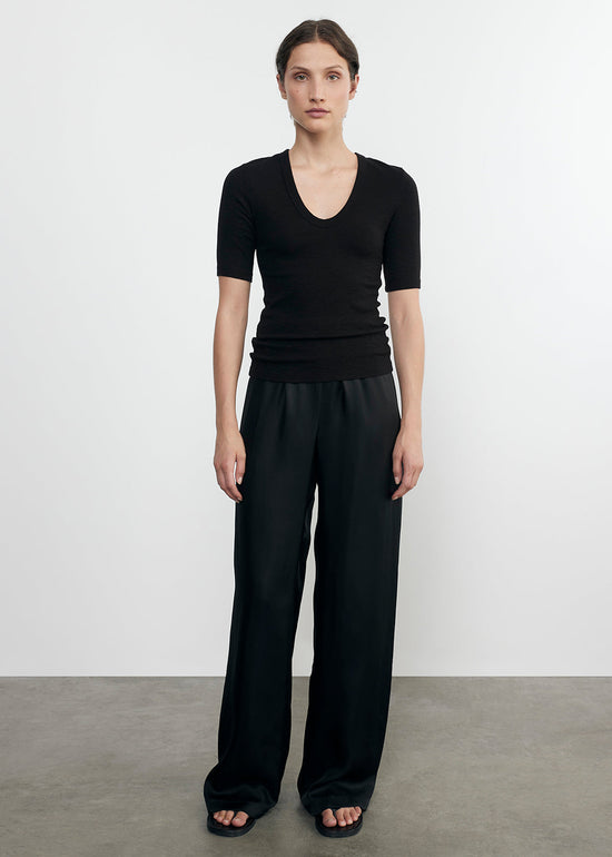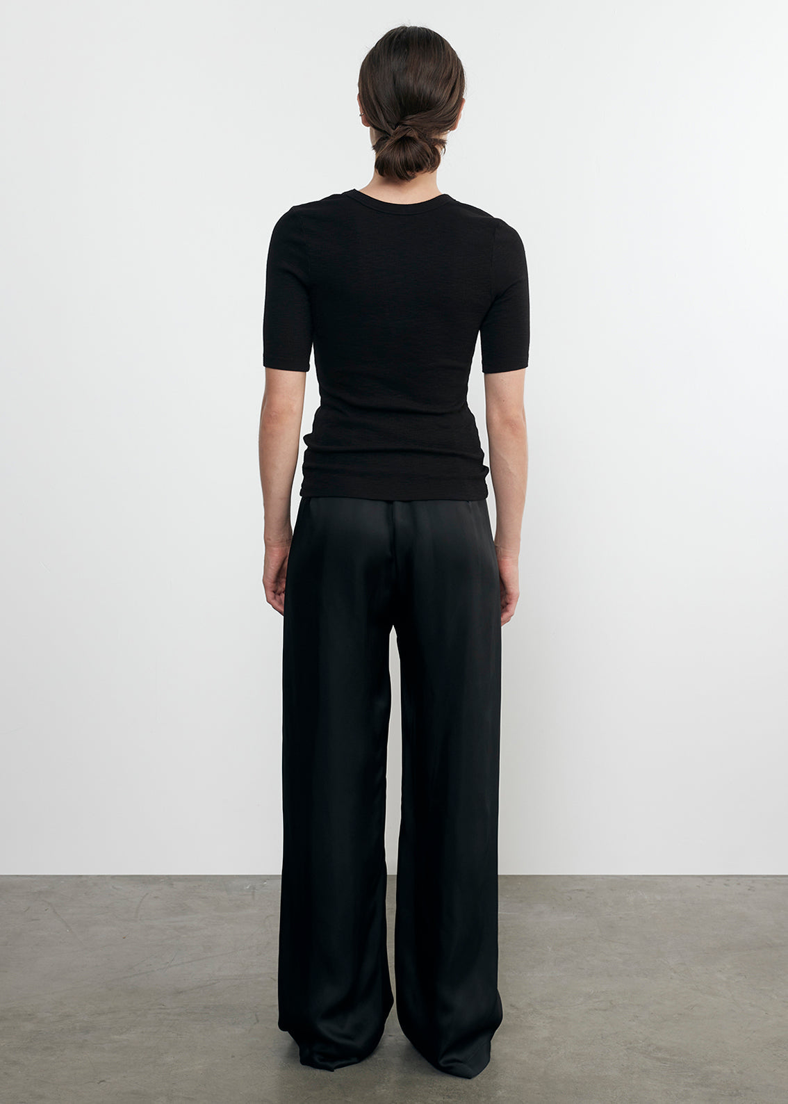 Crafted from a premium silky twill fabric, the Fluid Twill Pant offers a sumptuously soft feel, a subtle sheen, and a beautiful drape. The twill weave adds a touch of texture and sartorial elegance, perfect for effortless style from day to night.