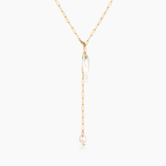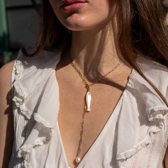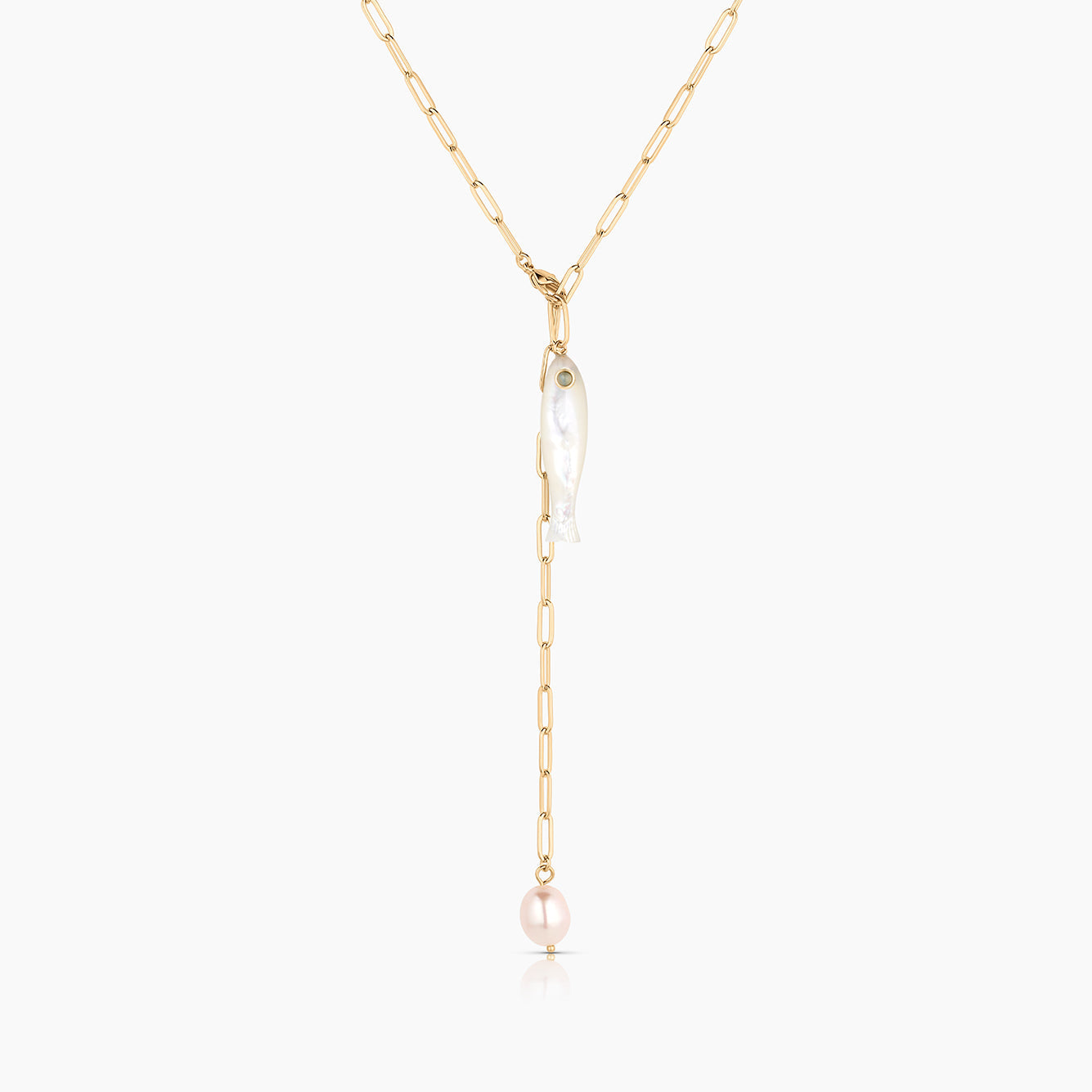 She’s a bestseller for a reason. This playful yet chic necklace features a hand-carved mother of pearl fish charm (with a touch of luck from its amazonite eye!) clipped onto a delicate pearl lariat. Perfect for everyday wear, the charm is removable, so you can style it on other chains or layer it with your favorite pieces.