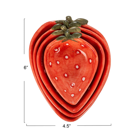 1, 3/4, 1/2 & 1/4 Cup Hand-Painted Stoneware Strawberry Shaped Measuring Cups, Red, Green & White, Set of 4