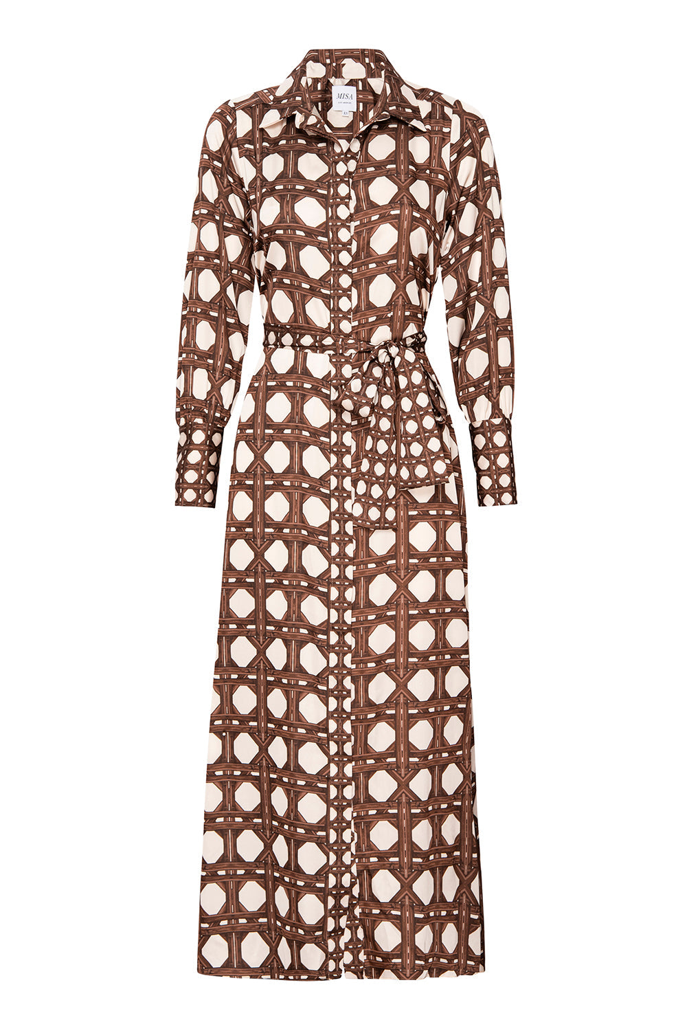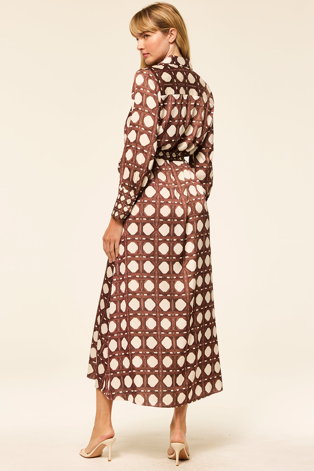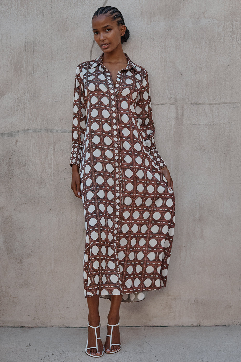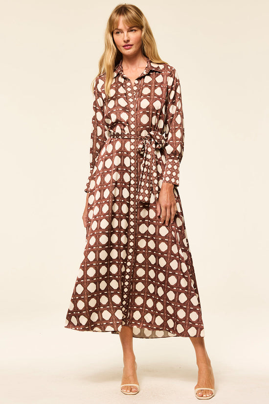 The Herminia Dress from MISA is a refined take on the classic shirtdress, elevated in a rich Chocolate Rattan printed satin. This ankle-grazing silhouette features a sleek covered button placket and a contrasting scale rattan print that adds depth and detail from cuff to hem. With a structured fold-over collar, long sleeves with wide button cuffs, and practical slit pockets, Herminia blends sophistication with ease. The optional self-tie belt lets you define the waist—or wear it loose for a more relaxed look. This is the kind of timeless piece that effortlessly transitions from day to night, season after season.