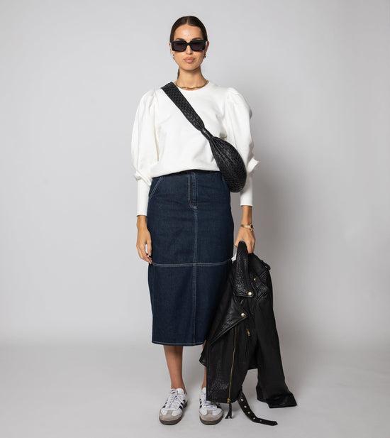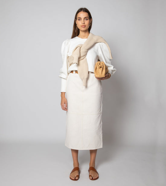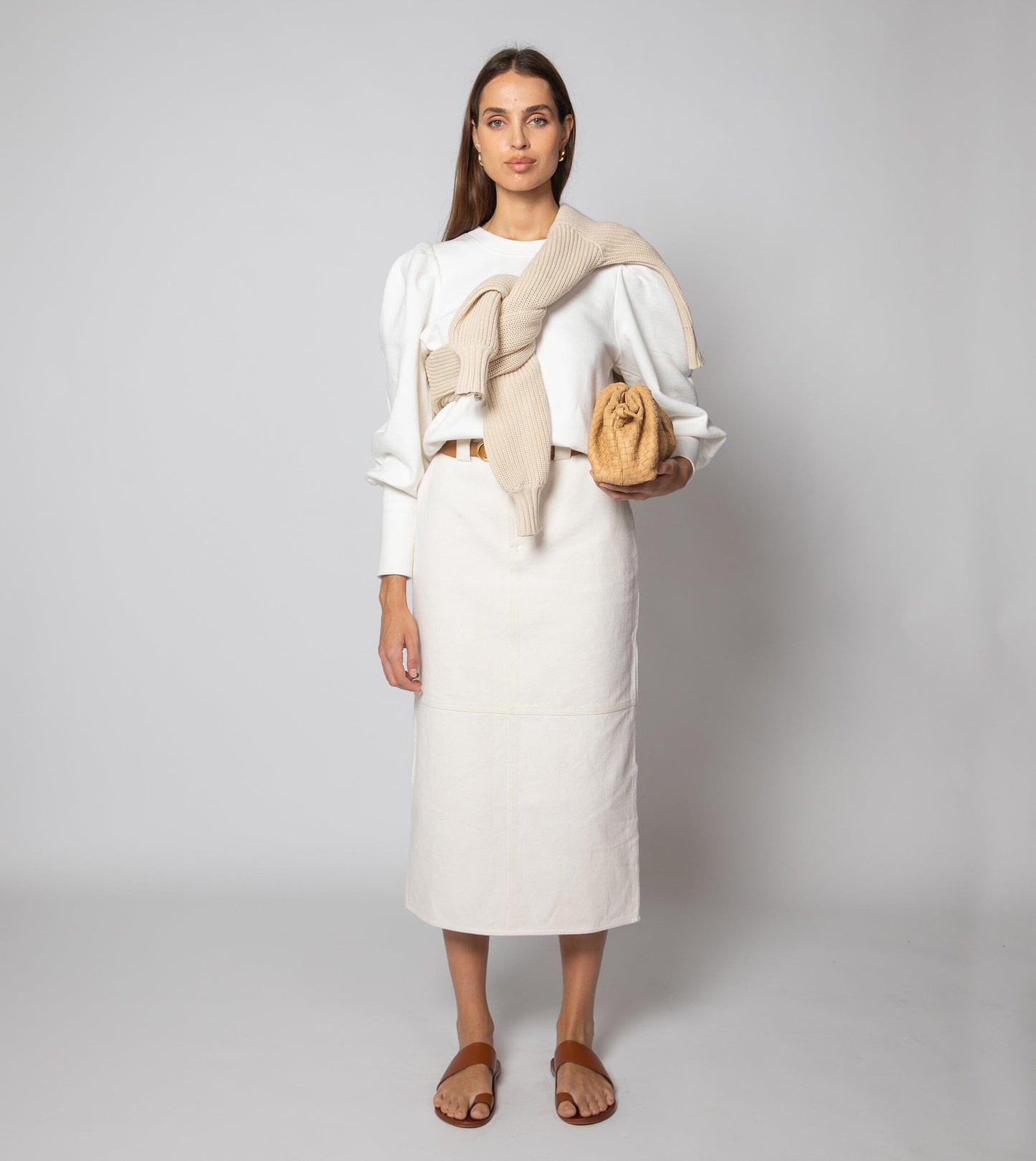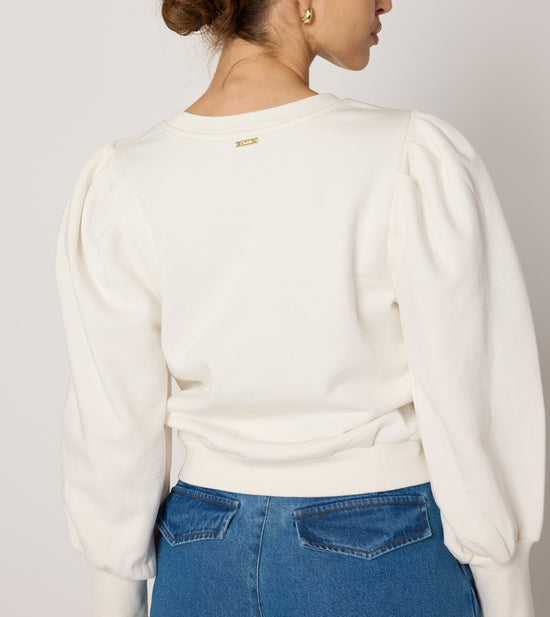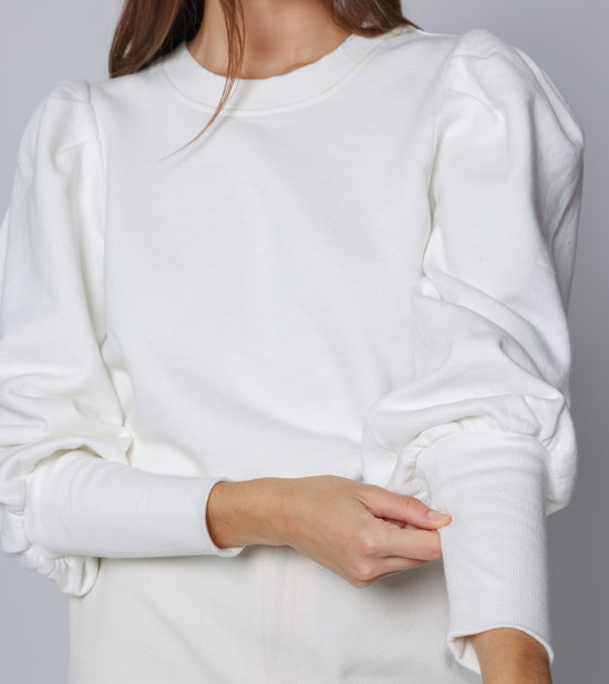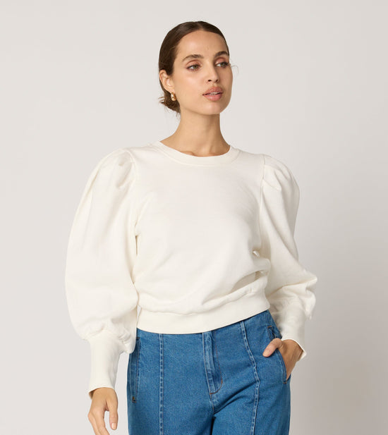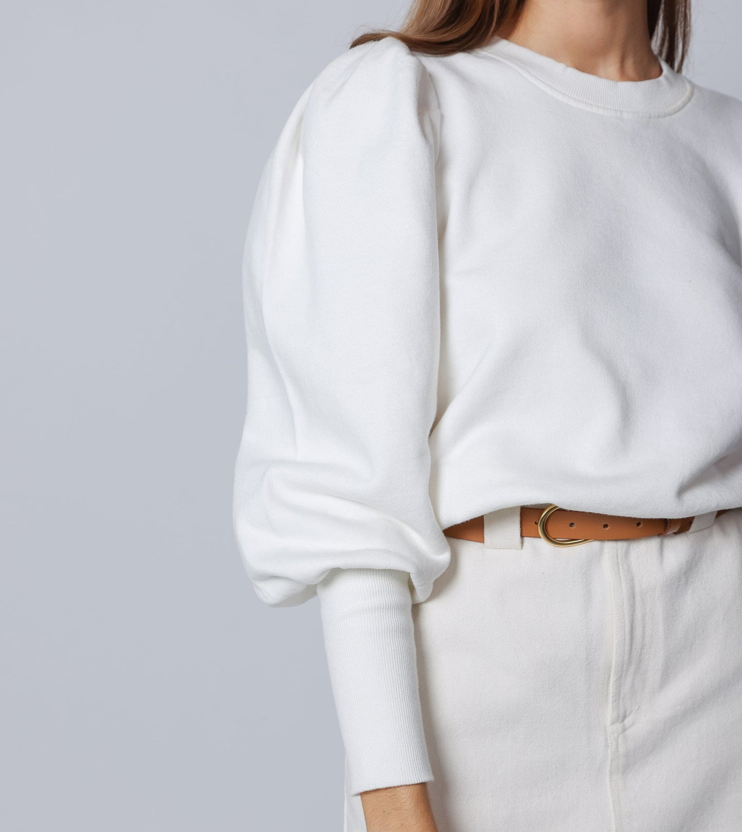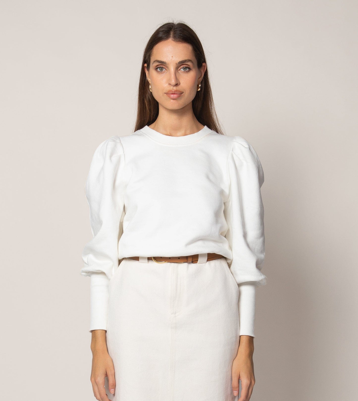 Introducing Cleobella's Core Collection. In organic cotton fleece, The Indi Sweatshirt features puffed high cuff sleeves for an elevated take on loungewear. Whether you're dressing it up or down, it's perfect for staying warm on chillier days. Pair back to any of our bottoms for an chic yet comfortable look. See below for styling inspo!