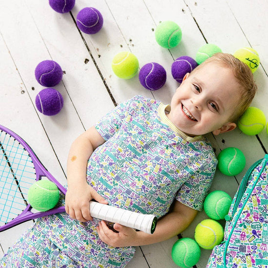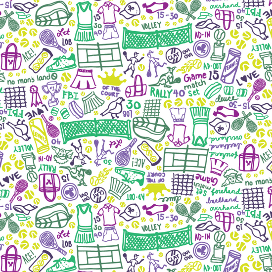 Serve up sweet dreams of Tennis in these Two Piece Pajamas! Exploring Eliza's hand-drawn print is like watching a rally, don't take your eye off the ball or you will miss all of the clever nods to the great sport cleverly represented in her print! Game, set, match - you'll be dreaming of ace serves in these tennis pj's!