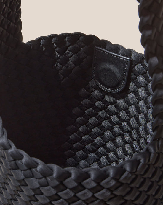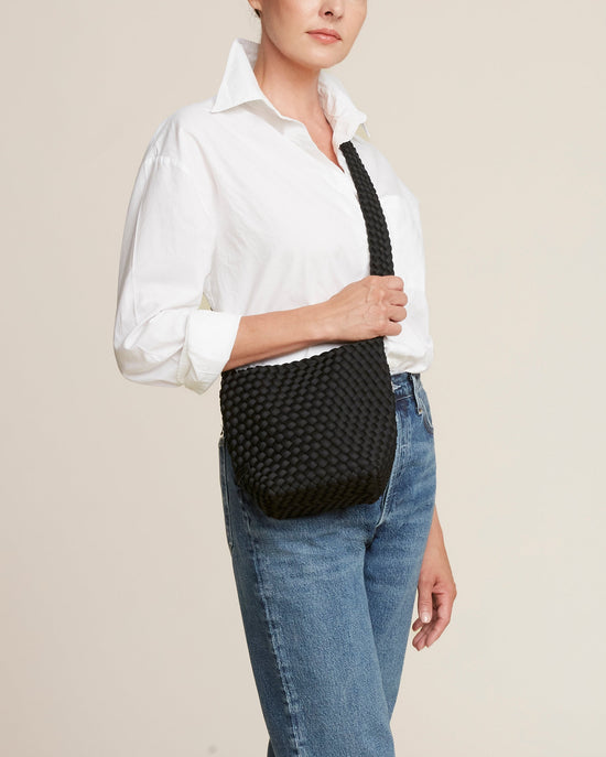The Naghedi Laguna Crossbody offers a perfect blend of style and convenience for hands-free wear. Handwoven from durable neoprene in a sleek true black, this lightweight bag is designed for all-day comfort. Thoughtfully sized at 7 inches in height, 10 inches in width, and 4.5 inches in depth, with a 17-inch handle drop, it provides easy access to essentials with an open top and secure magnetic closure. The strap is crafted to gently stretch to the perfect length with wear, while a coordinating neoprene zippered pouch adds extra functionality and organization.