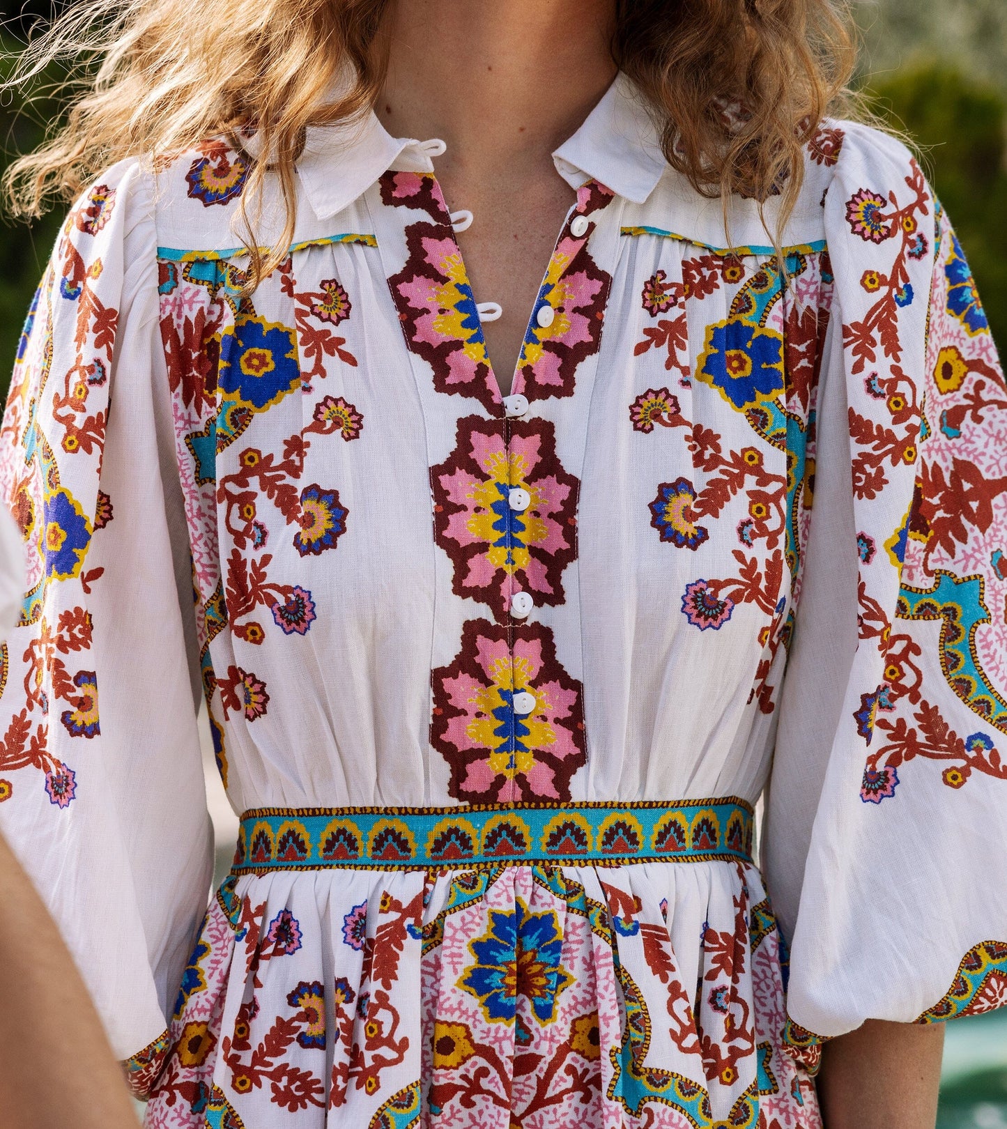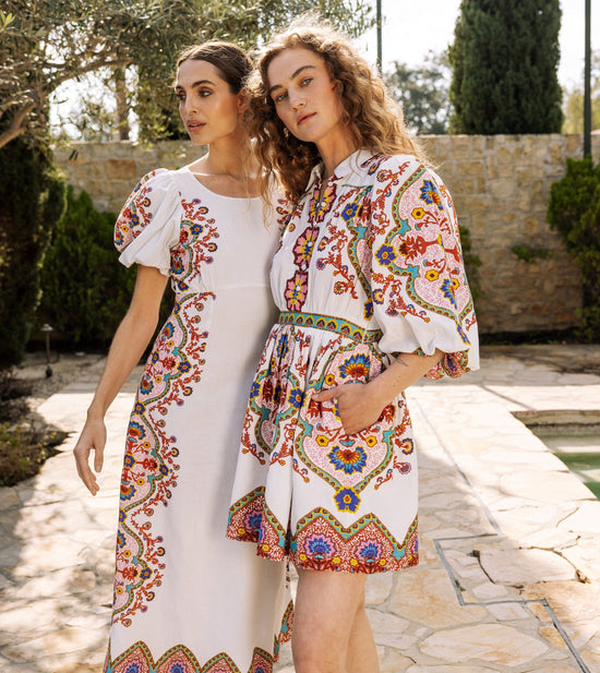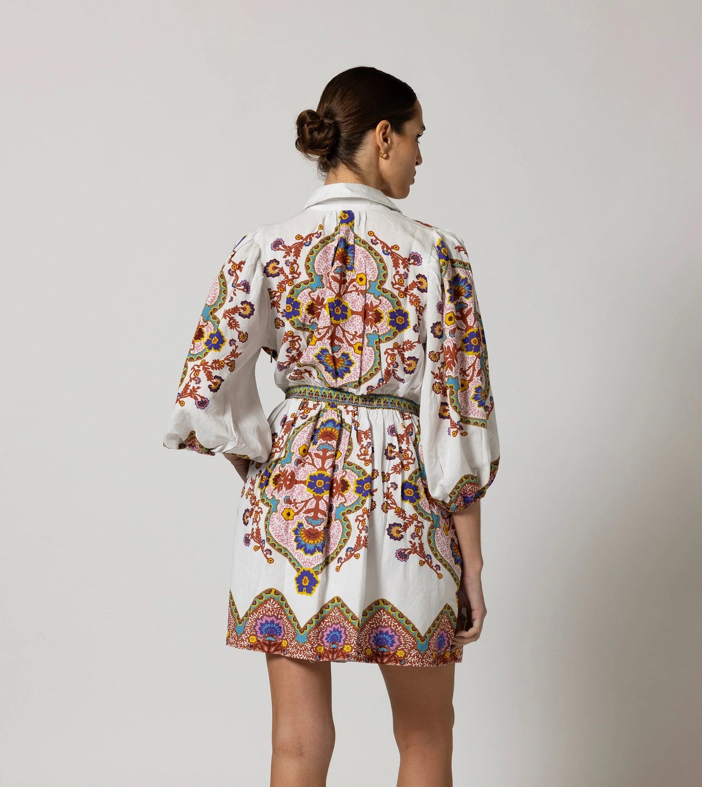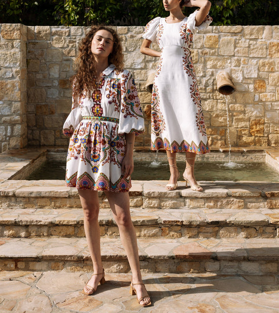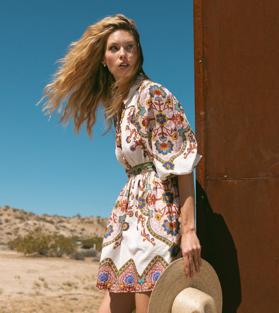 Ethically handmade from a cotton linen blend, the Leigh Mini Dress features long sleeves with intricately placed prints. Shell buttons embellish the front while encased elastic at the waist makes for the best and most comfortable fit.