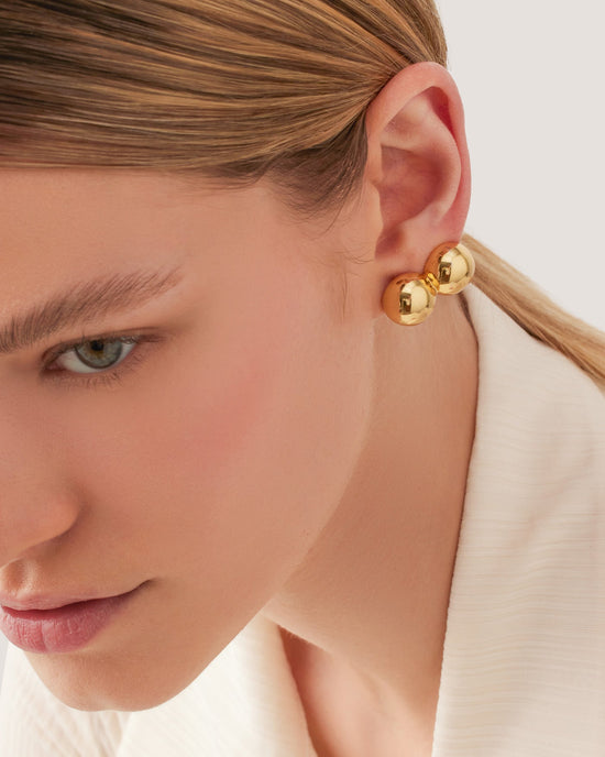 Sleek, sculptural, and slightly celestial, the Lyra Climbers create the illusion of a double piercing with two luminous spheres that catch the light from every angle. Designed for a secure and comfortable fit, the bottom sphere features a post backing while the upper sphere clips in place, ensuring the perfect balance of structure and shine. Finished in high-polish 14K gold-dipped brass, these earrings bring modern elegance with a cosmic edge.