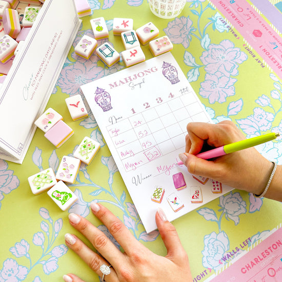 Keep score with our stunning mahjong scorecards! These scorecards match our Taylor Tiles collab with Oh My Mahjong. Write a fun little note on the back to commemorate the fun time had playing mahjong with your besties.