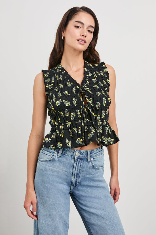 The Martine is a structured peplum tank crafted from heavy cotton poplin. Front ties serve as adjustable closures for the plunging neckline, while delicate ruffle details complete the look.