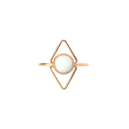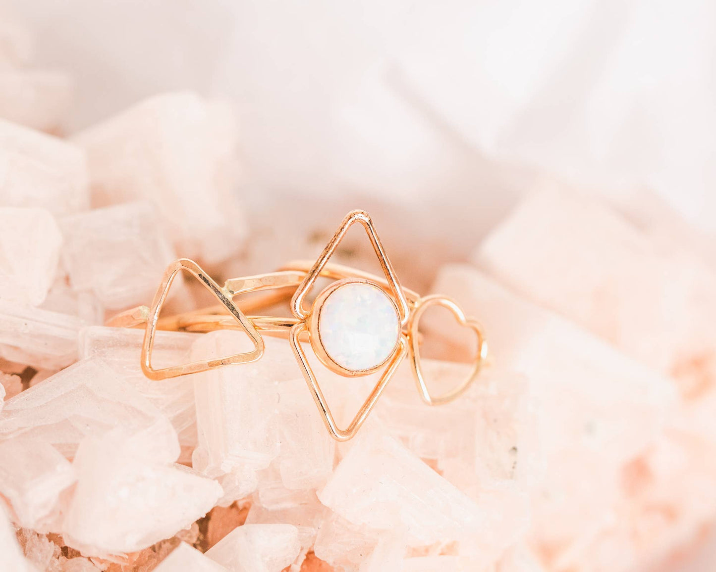 This statement ring stands out in a crowd and pairs nicely with other simple stackers. Features a bezel set stone with an open goldfill triangle point on each end. Stone is a synthetic opal giving each ring a unique look and a bit of shimmer.