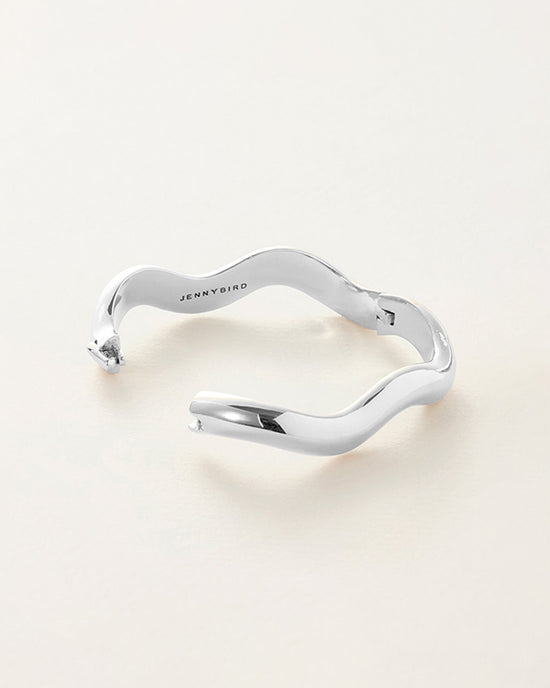 A bold, curvy bangle that makes a major statement. For double the curves, stack with another Ola Bangle, or mix in a gold version for a two-tone effect. This high polish bangle opens and closes with a hinge and tab lock closure. Listen for a "click" to ensure tab is locked properly. Note: this design wears best when the closure is secured on the inside of your wrist. Finished in high-polish silver.