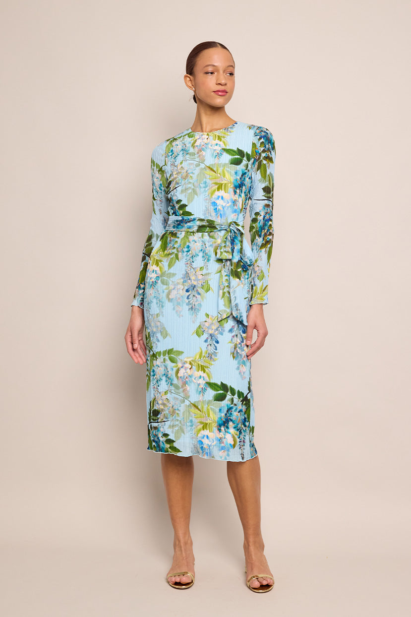 Effortless chic meets unmatched elegance in the Pepper Dress. This long-sleeve midi dress is designed for a straight fit, with a removable self sash for added versatility. Crafted in pleated textured silk, it features delicate details like a decorative lettuce-edge hem and sleeve finish. The back bodice includes fisheye darts for a subtly tailored look, while the fully lined body ensures a smooth drape. Finished in an allover print, this refined silhouette is perfect for both day-to-night dressing.