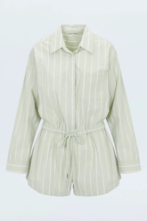 Breezy, transitional romper crafted from lightweight cotton poplin. Designed with a collared, button up bodice that falls into a relaxed short silhouette with an adjustable drawstring waist. Pistachio Stripe is a cool like green contrasted by a white pinstripe overlay.