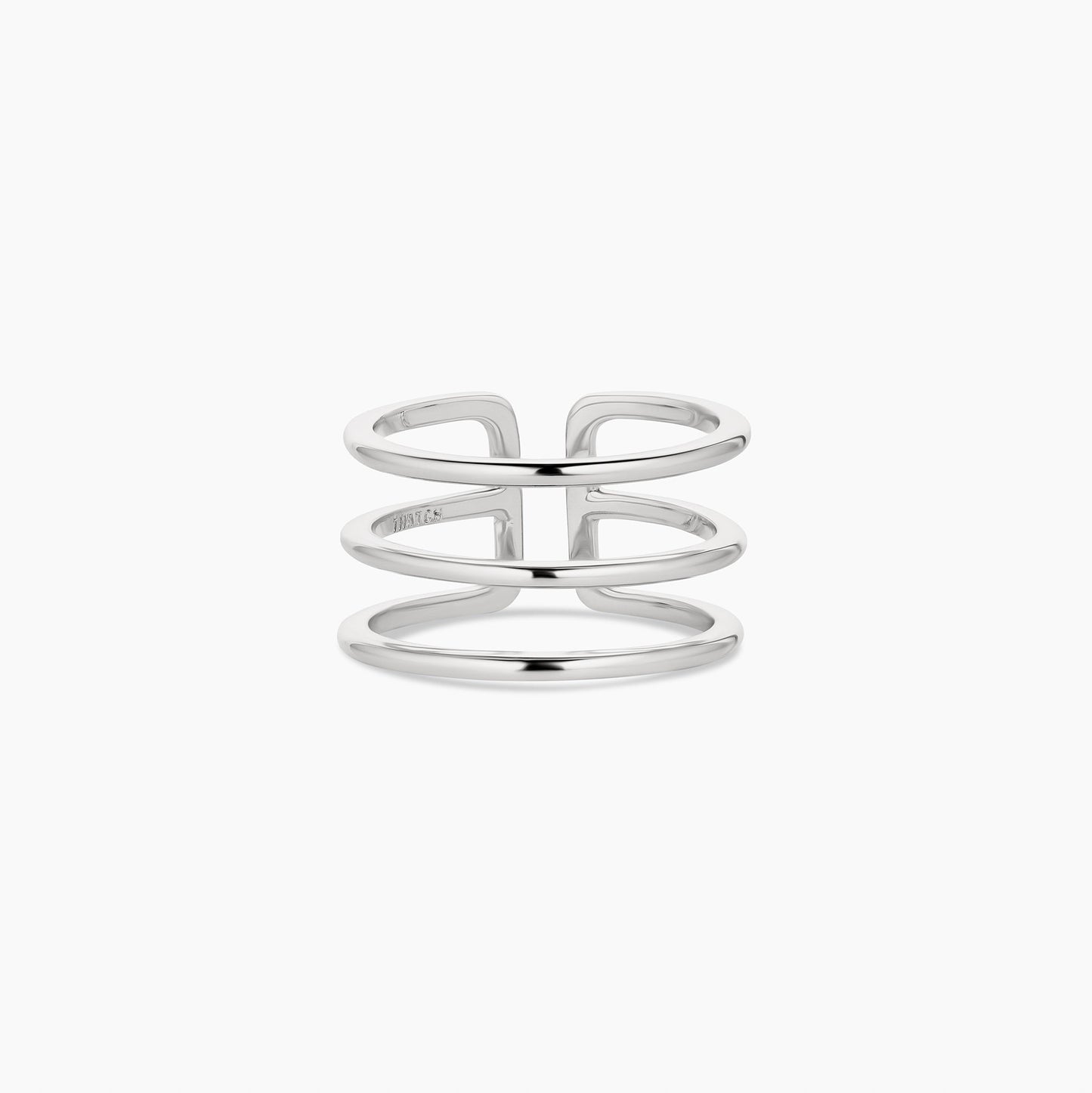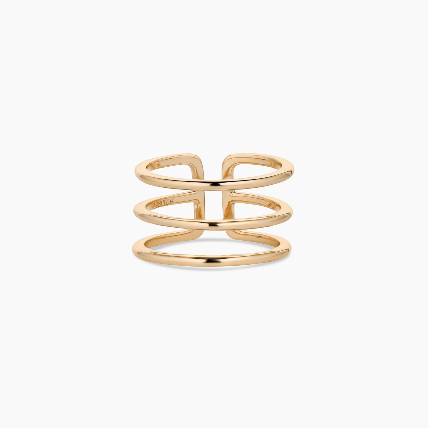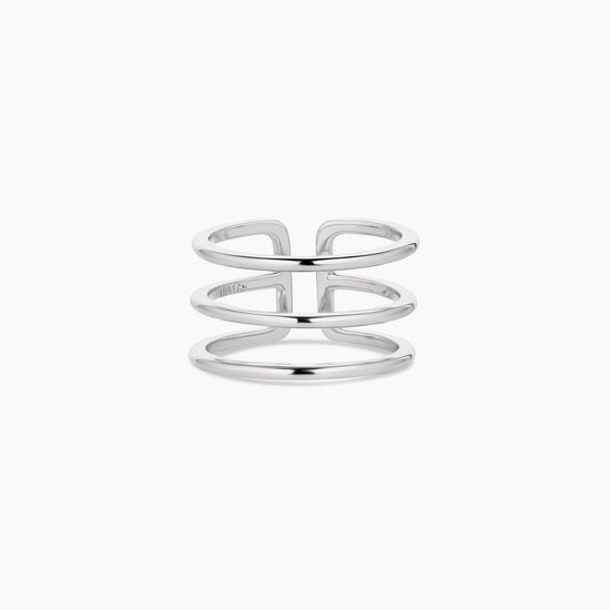 The stacking ring of your dreams—Cool and effortless styling in a high-shine three-in-one ring. 14k gold or rhodium plated open-back (or front) triple stack ring. Slightly adjustable.