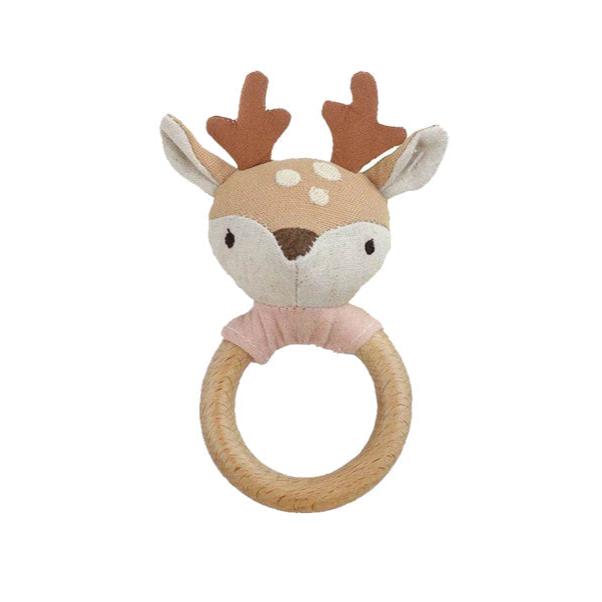 We got you moms and dads: help for teething is here. We've made this rite of passage as fun as possible with our Fawn Wooden Teething Baby Rattle. Meticulously crafted of a non-toxic wood devoid of harmful chemicals, this 100% natural wooden teether is incredibly safe for your developing child. Adding an extra element of surprise, it also doubles as a linen baby rattle. A sweet fawn face at the top of this wooden baby rattle charms a child and makes a soothing sound when shaken.