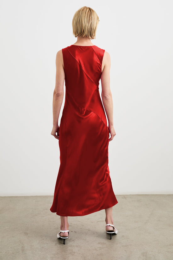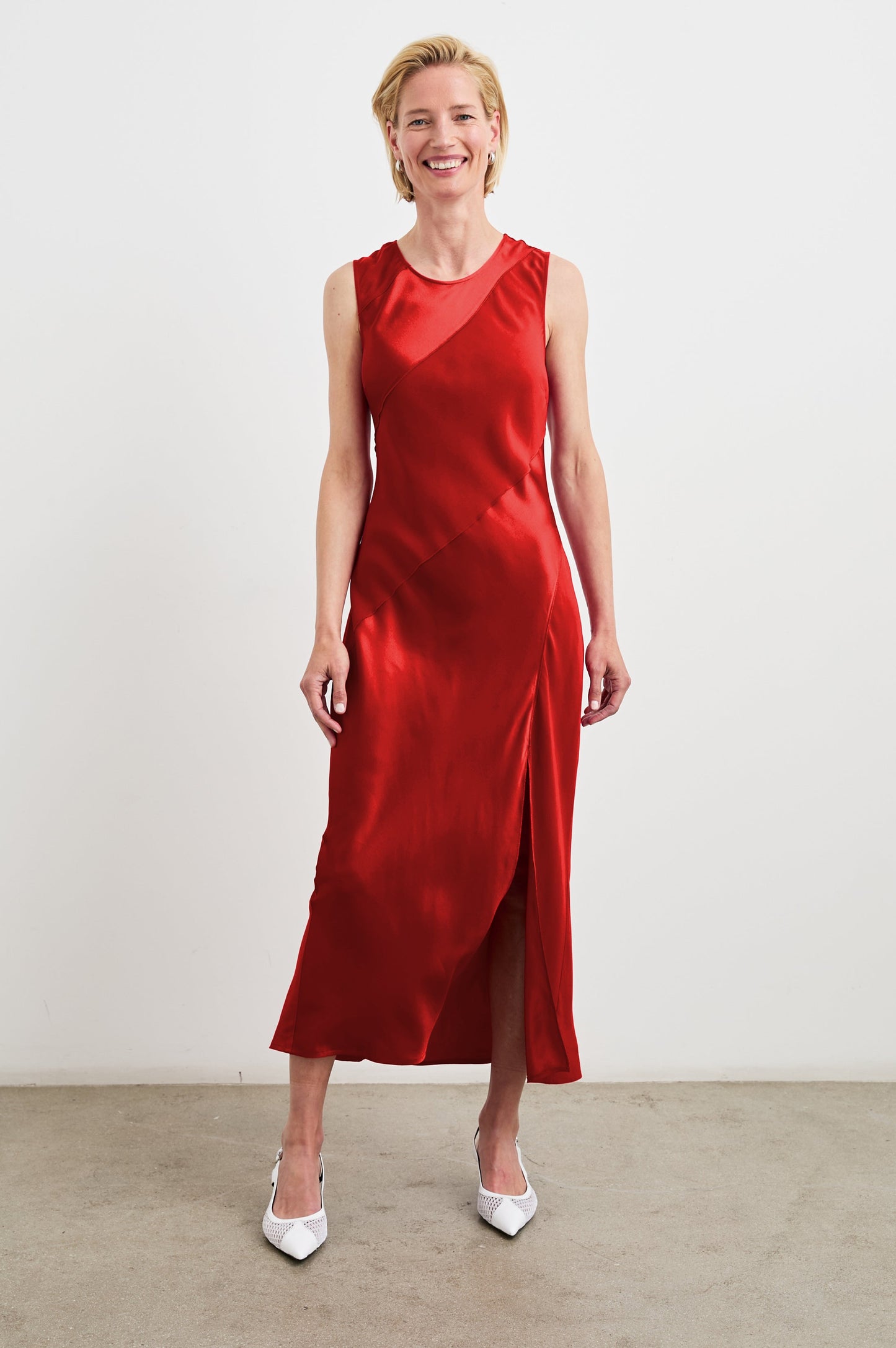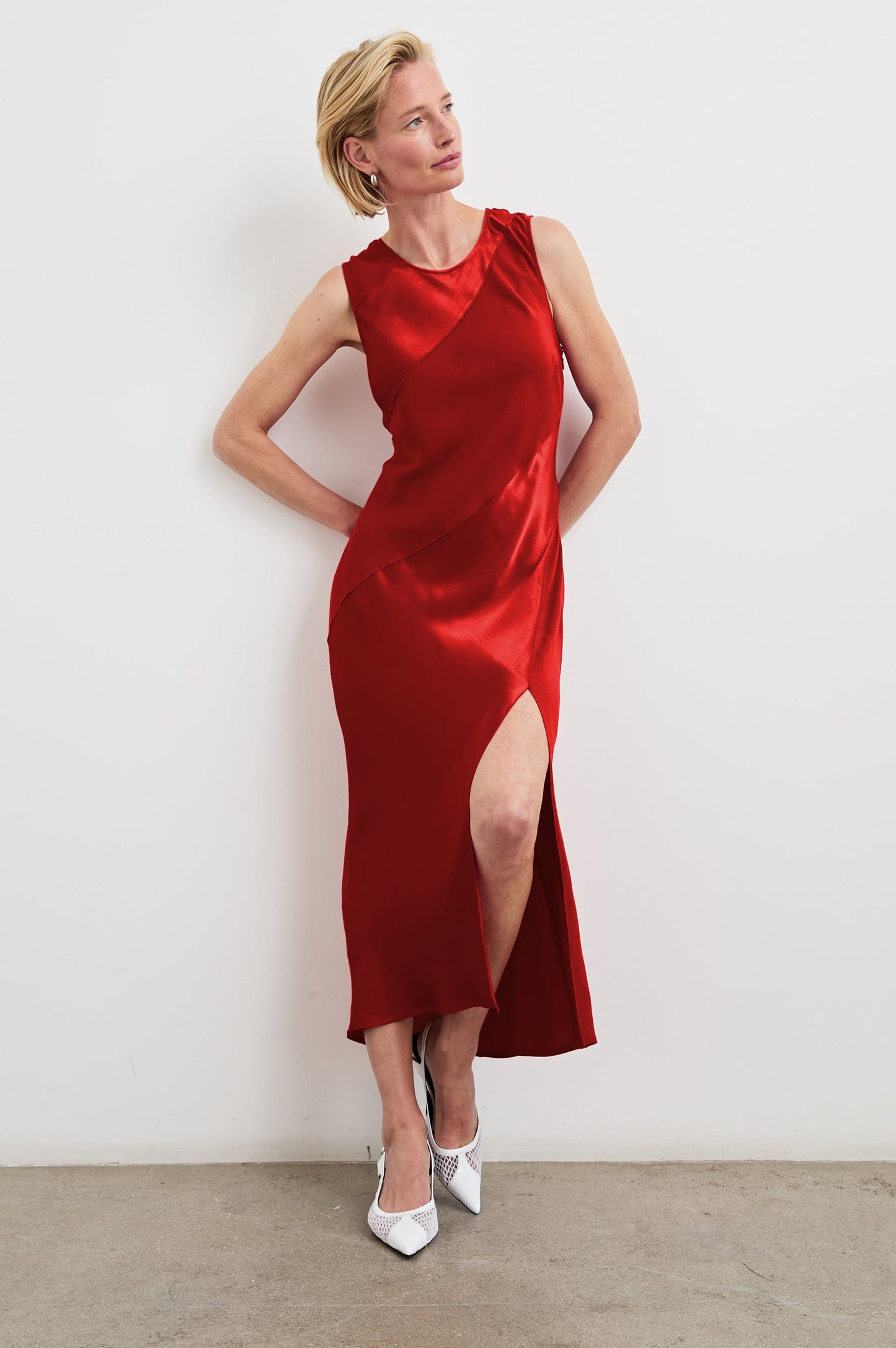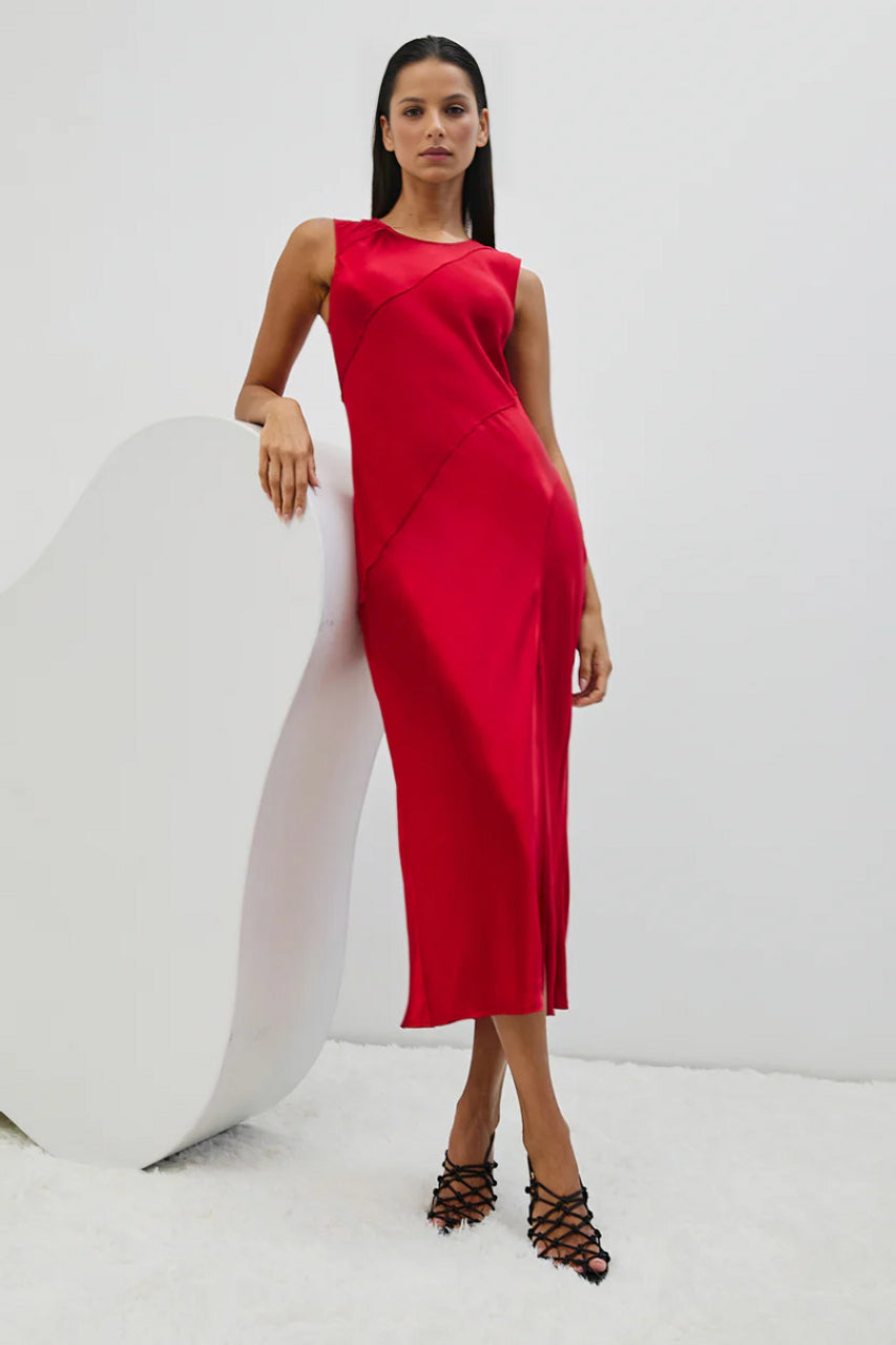 It's Sanya season. Paint the town red in this stunning bias-cut midi-dress, crafted from luxe satin crepe. Finished with a front thigh slit and contrasting matte diagonal panels, steal the show wherever you go.