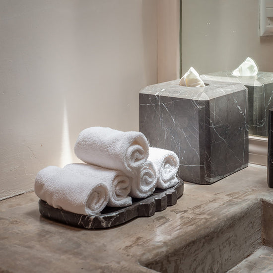 Beautiful hand carved marble tray. Functional to place towels, dispensers, containers, bathroom products or cosmetics.