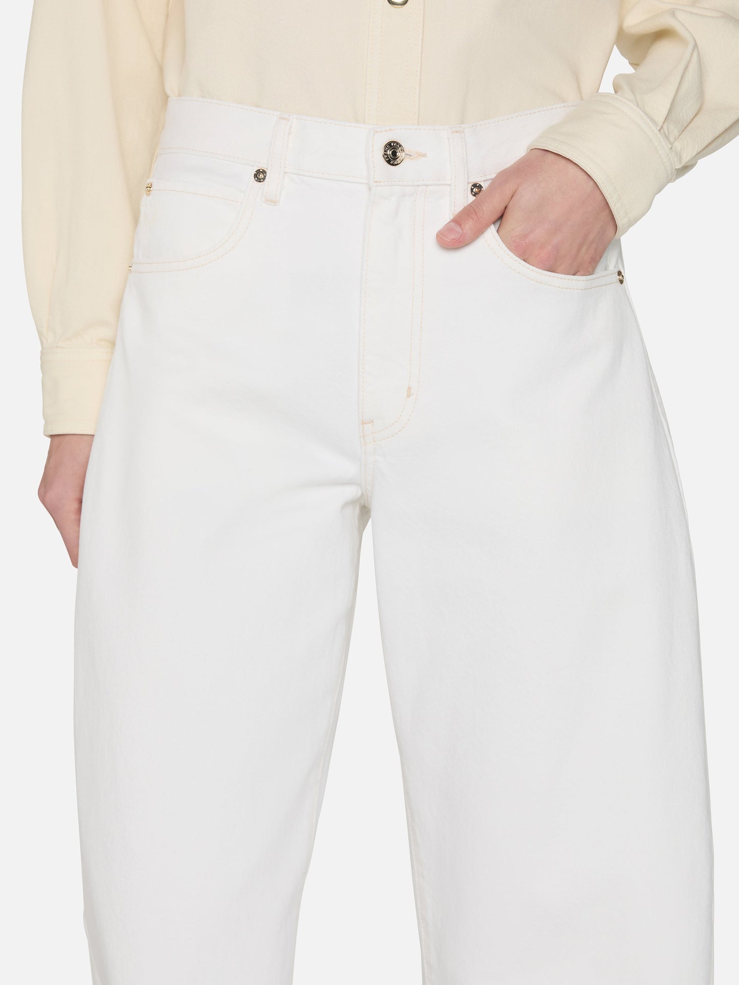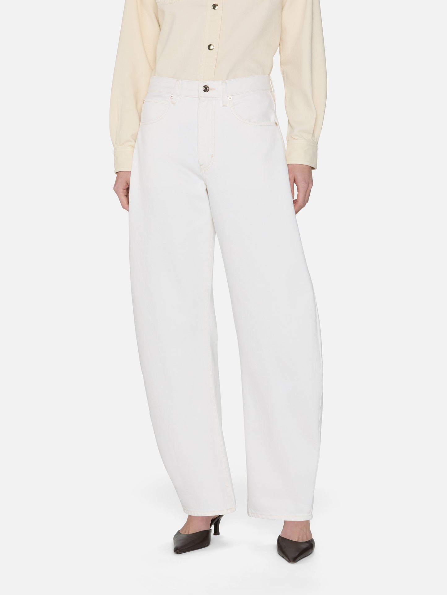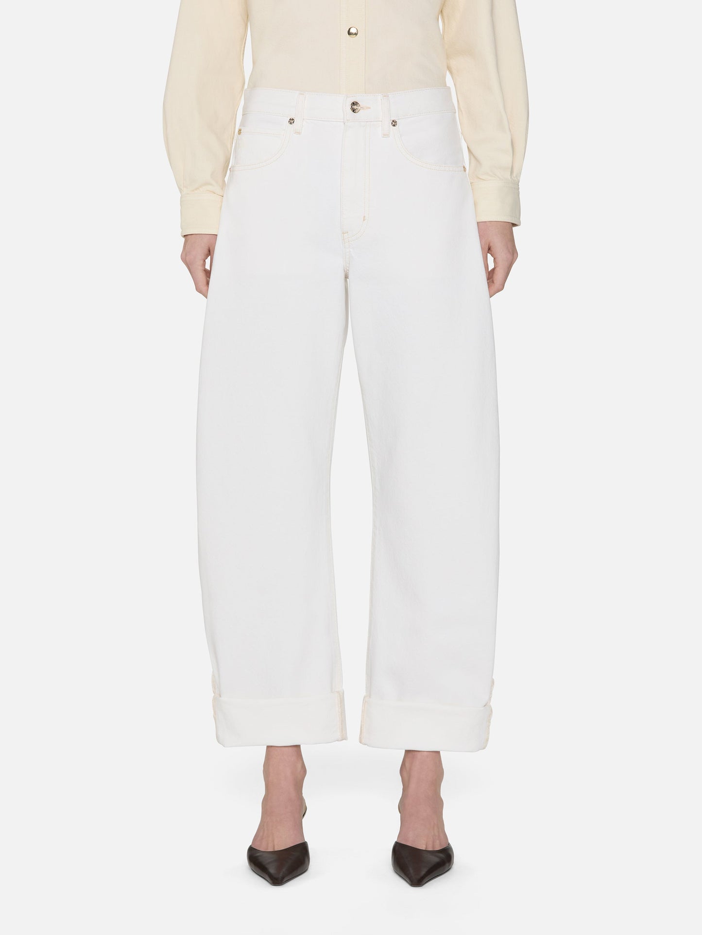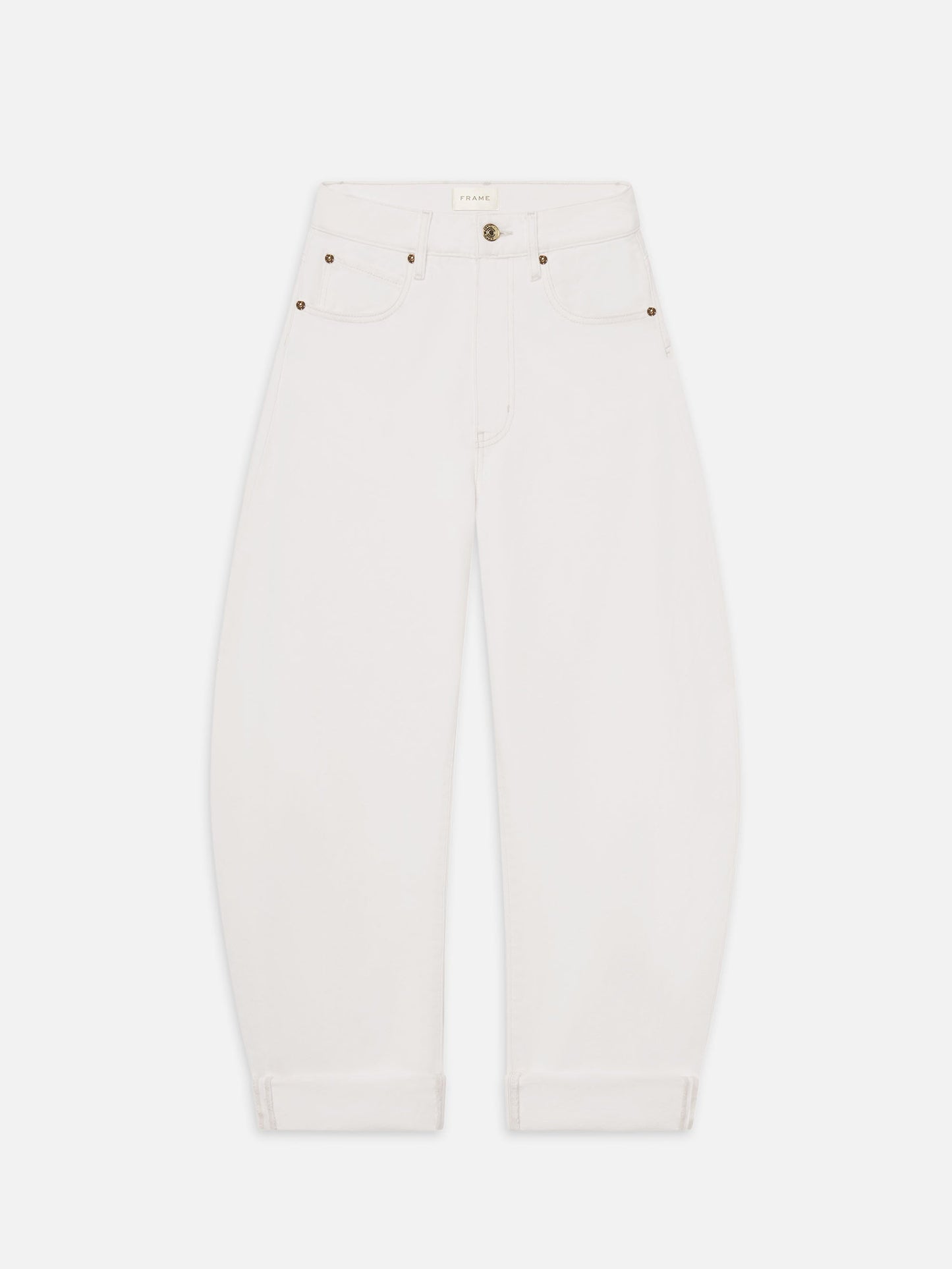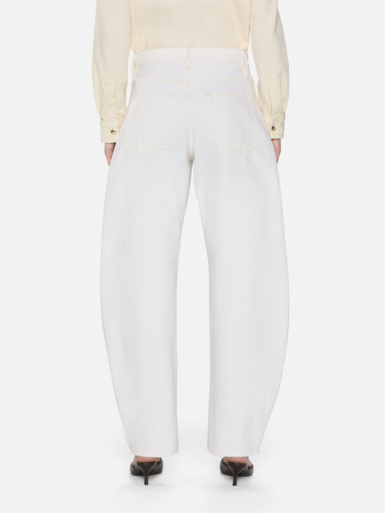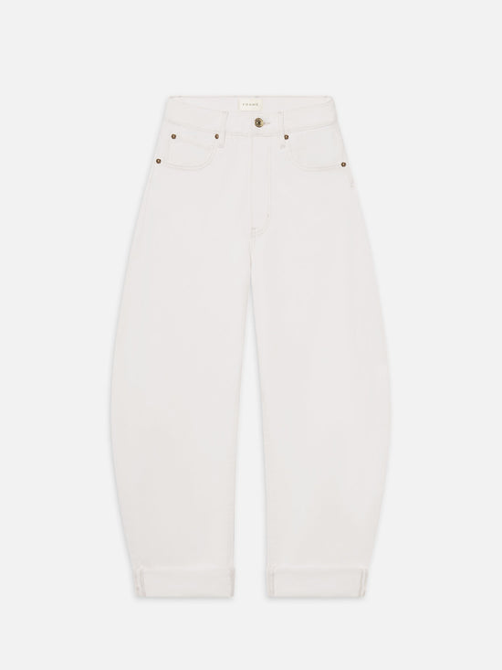 An exaggerated take on the trending barrel silhouette, this unique fit is your new closet necessity. With a flattering high rise, these jeans feature a curved outseam for a playful bubble effect. Designed to be worn cuffed and hit at the ankle, the 2.5" twice-rolled cuff can be unrolled for a longer, more dramatic inseam.