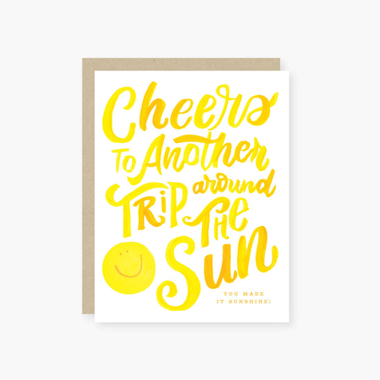 Cheers to another trip around the sun! It's hard not to smile when reading this bright yellow and happy birthday card. Hand painted and sure to make it's recipient smile.