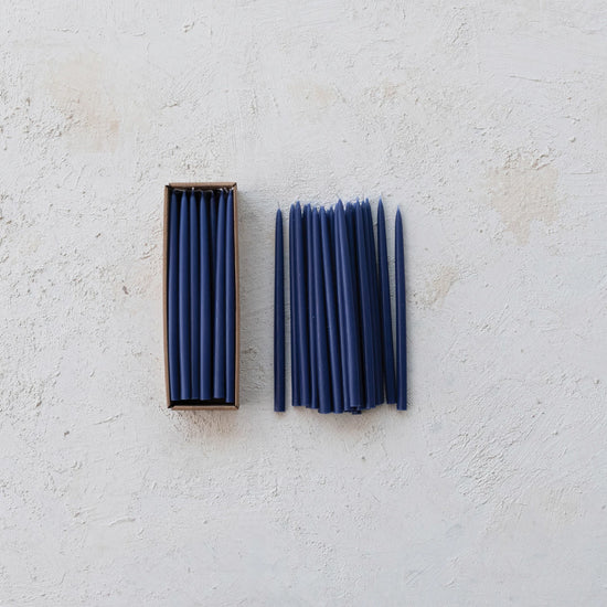 Approx. 1/2" Round x 10"H Unscented Thin Taper Candles in Box, Navy, Set of 24 (Est. Burn Time 3 Hours)