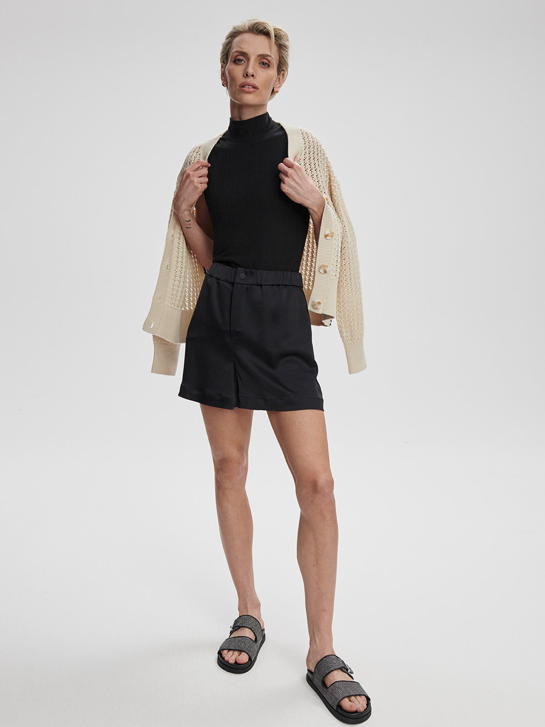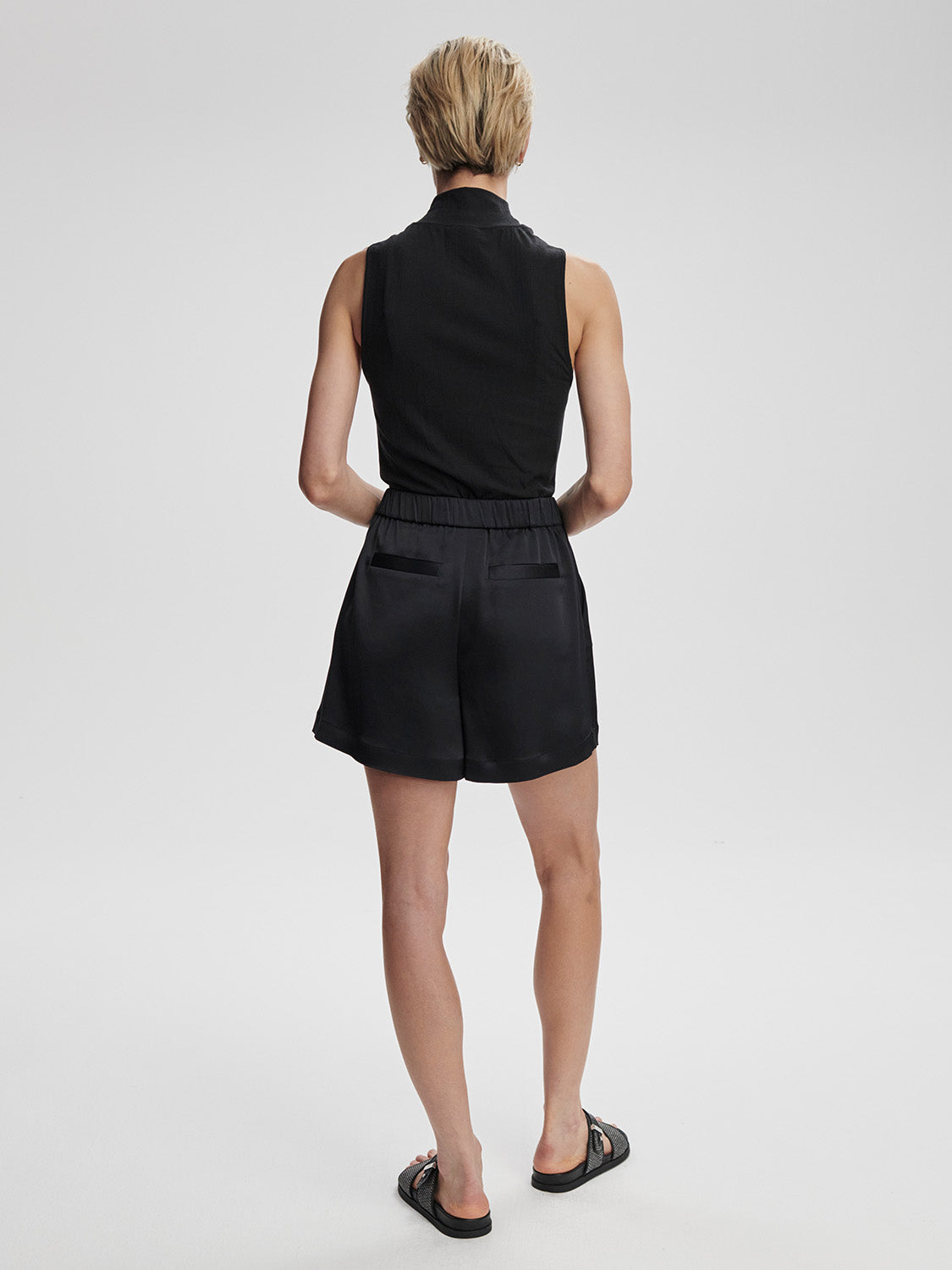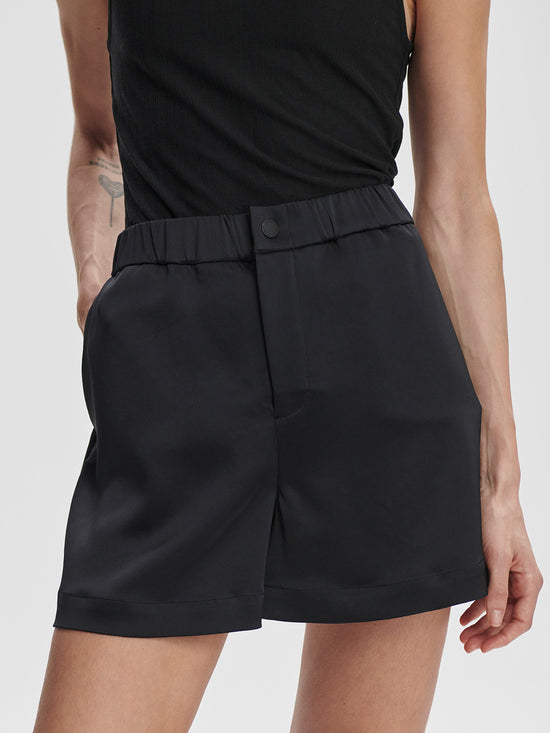 The Sarka High-Rise Short 4” by Varley is a polished warm-weather essential, crafted in a soft sateen fabric that brings subtle elegance to everyday wear. These high-rise shorts feature a fully elasticated, gathered waistband for comfort, with a flattering A-line leg shape that adds ease and volume. A snap closure and zip fly complete the tailored silhouette, while functional side-entry pockets and mock back pockets add refined detail.